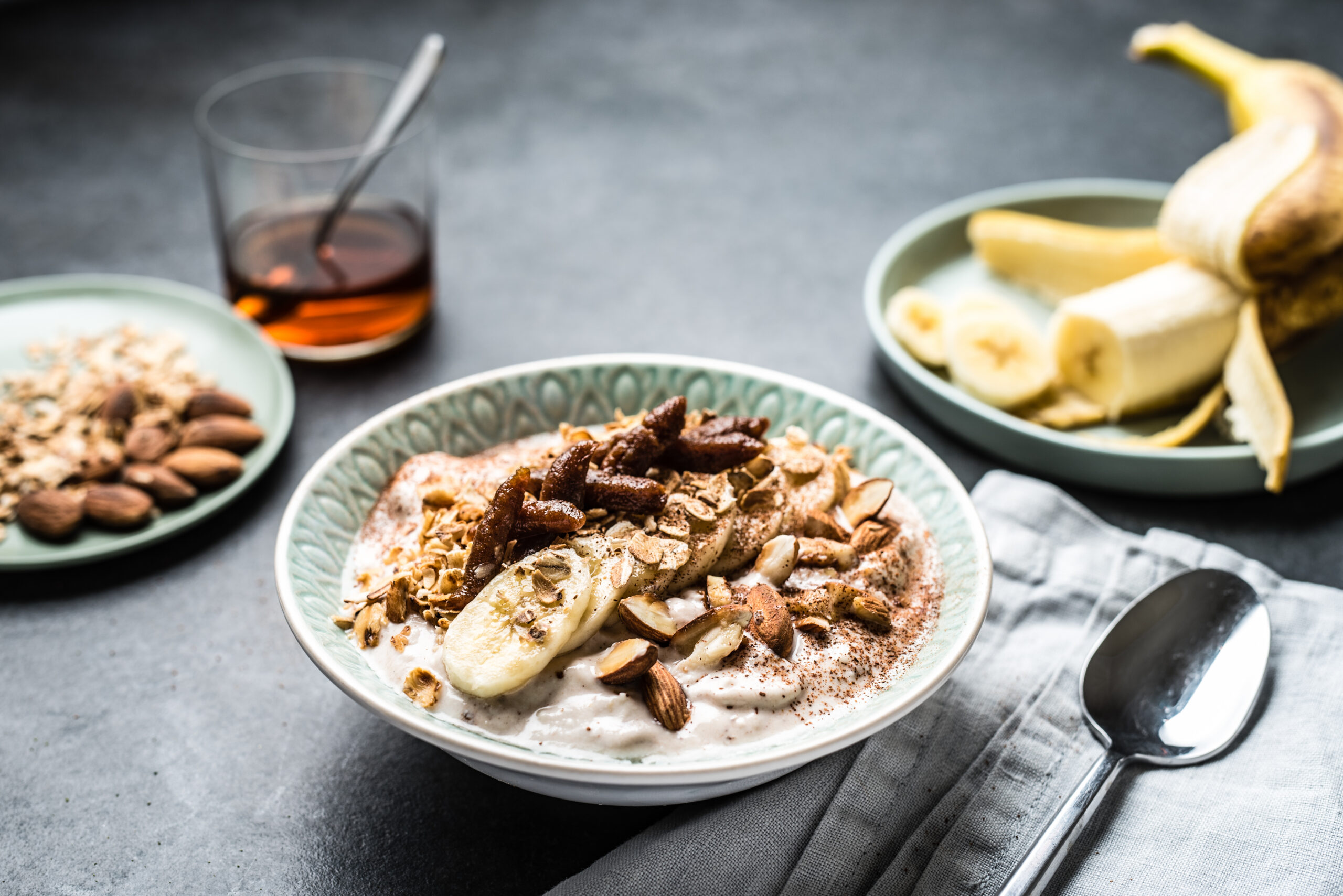 Aseta kausi põhja skyri-banaani segu, sellele tõsta röstitud kaerahelbed ja mandlid ning kõige peale kalla karamell.