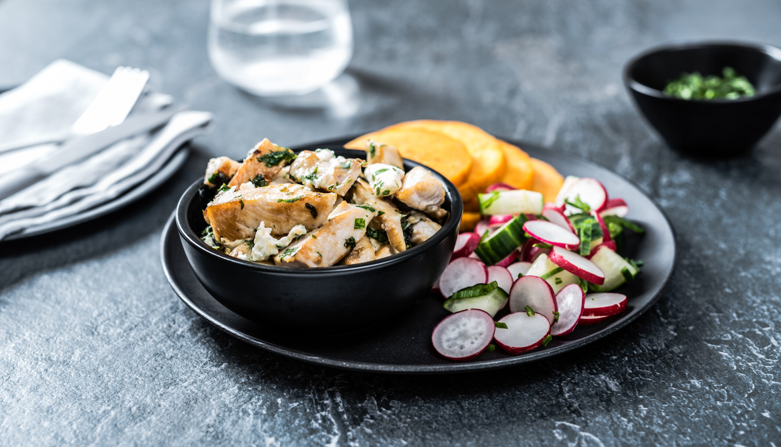 Serveeri bataat kana ja salatiga.