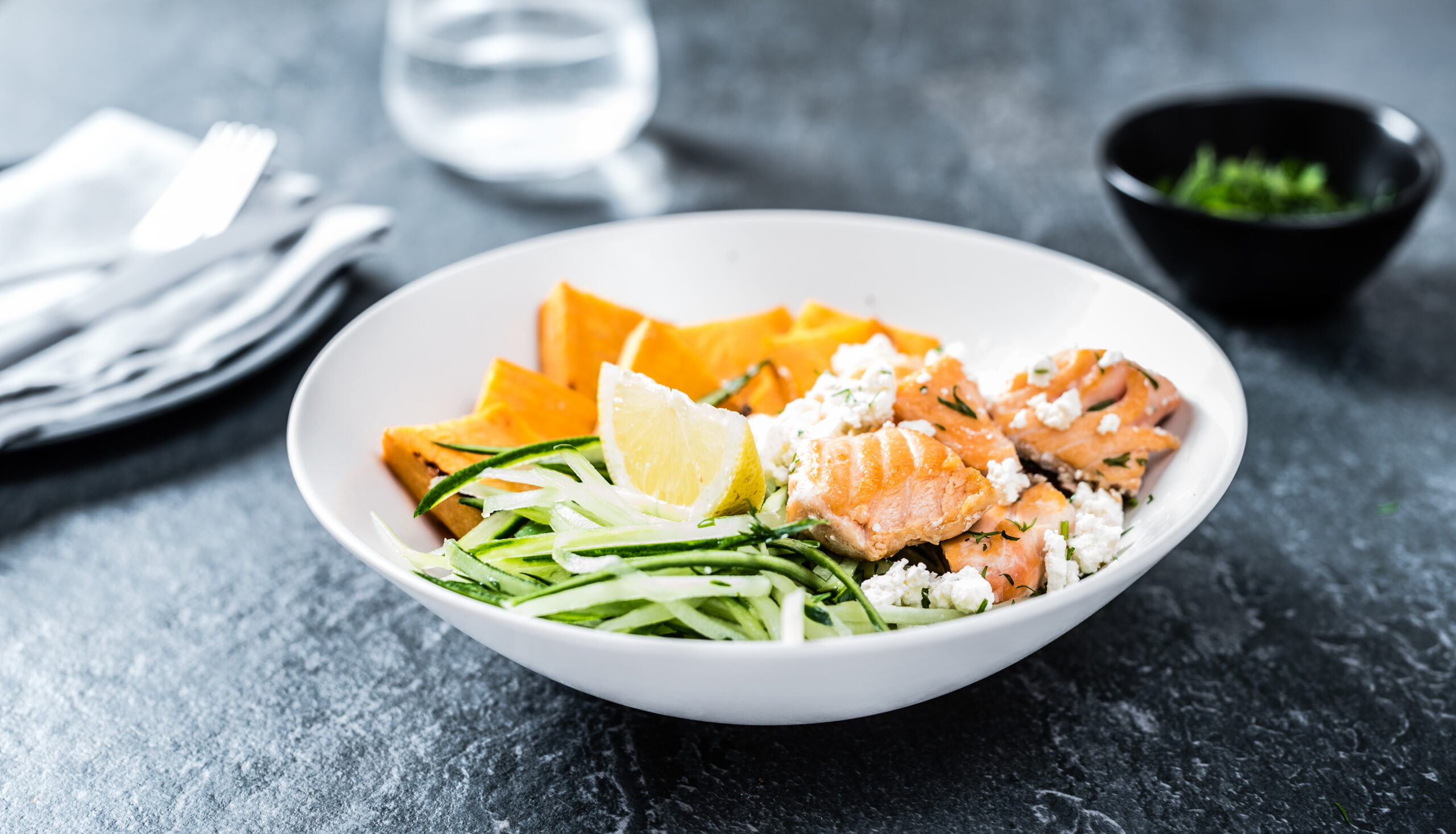 Serveeri küpsenud bataat lõhe ja kurgisalatiga.