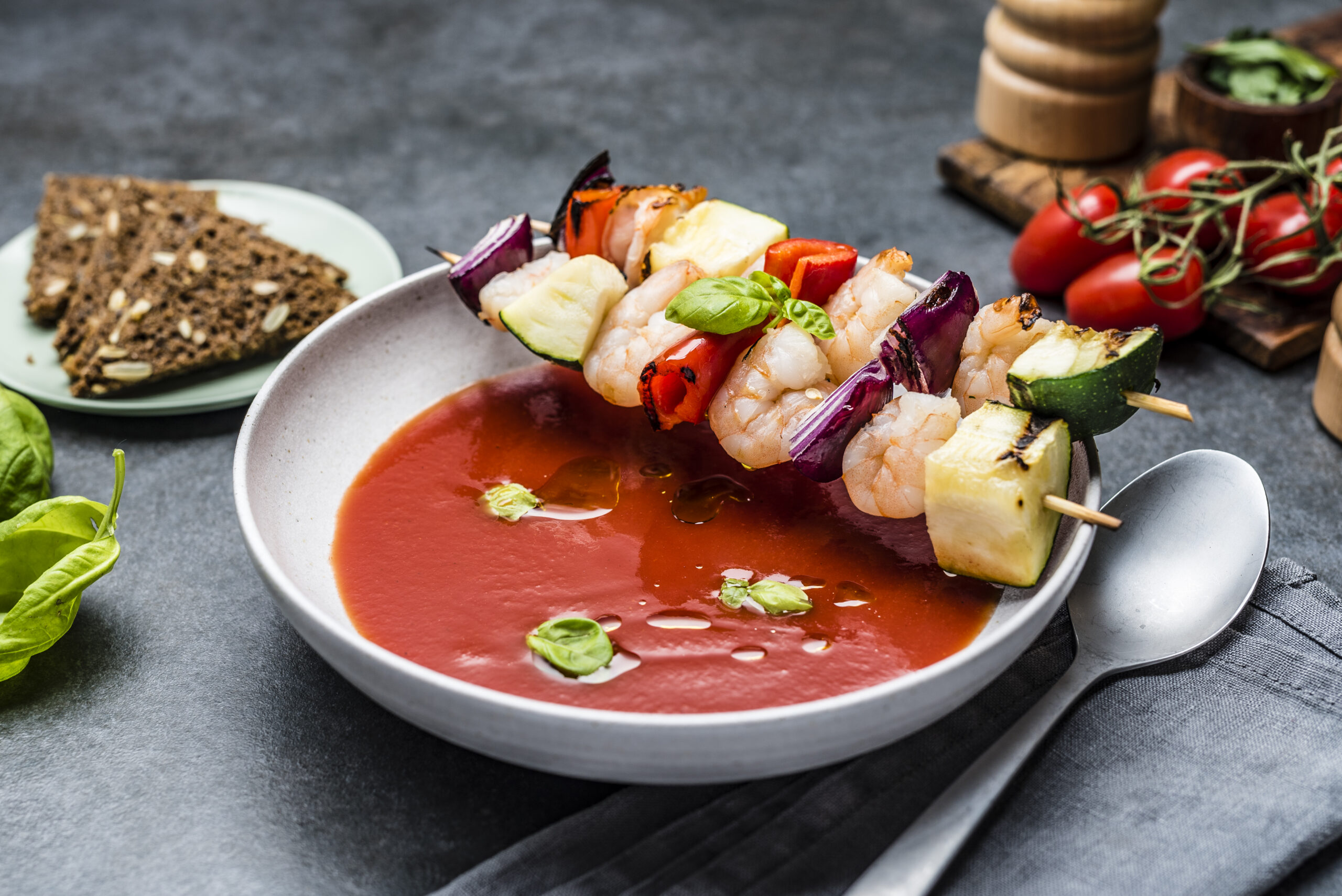 **Valmista püreesupp:** haki tomat, porgand, sibul ja paprika väikesteks tükkideks. Kuumuta potis oliiviõli ja prae köögivilju 3–4 minutit. Lisa vesi või puljong ja hauta 15–20 minutit, kuni kõik on pehme. Püreesta saumikseriga, lisa köögikoor ning maitsesta soola ja musta pipraga (soovi korral ka basiiliku või ürdisoolaga).