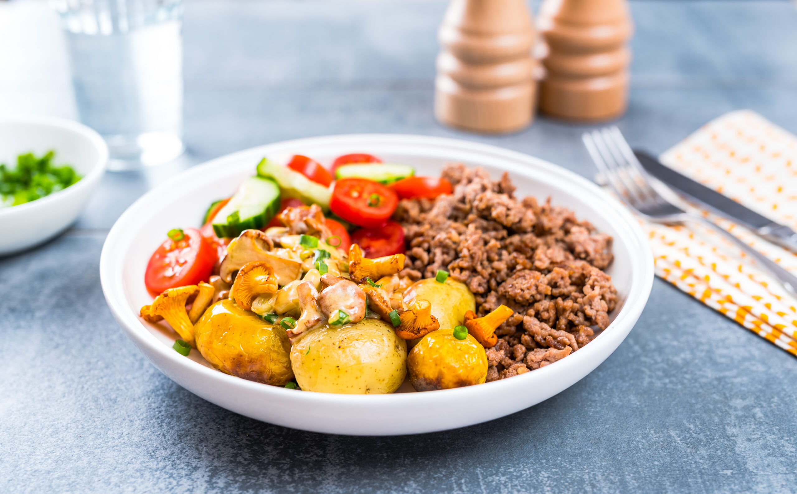 9. Serveeri praetud hakkliha kukeseenekastme, keedukartuli ja salatiga.
