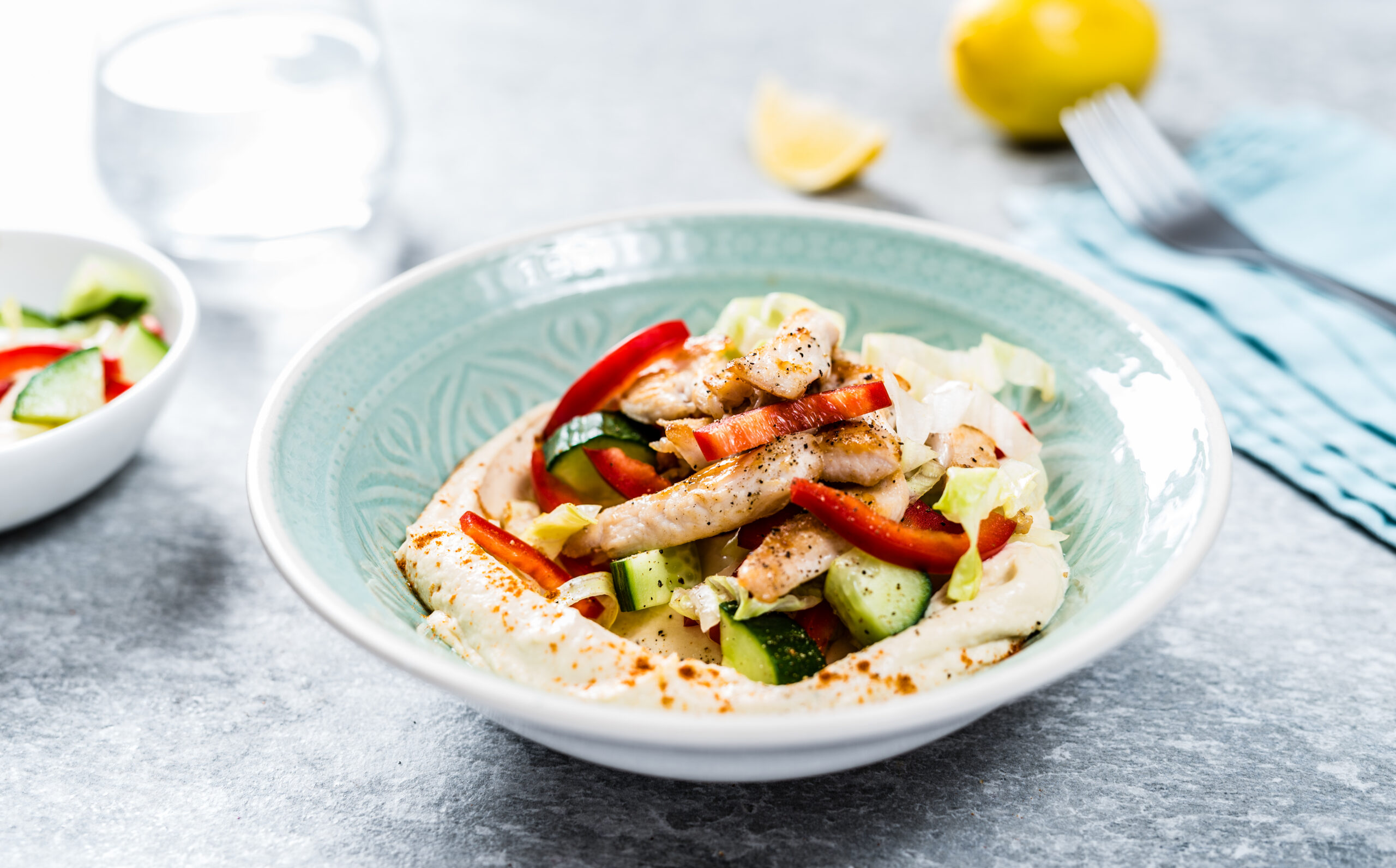 1.Pane pann tulele ja aja kookosõli kuumaks. 2.Lõika kanafilee ribadeks ja tõsta pannile praadima. Maitsesta soolaga. 3.Hummuse valmistamiseks pane kikerherned, sidrunimahl, tahini, oliivõli, paprikapulber ja sool blenderisse ning purusta kõik ühtlaseks massiks. 4.Tükelda jääsalat, kurk ja paprika ning sega salatiks kokku. 5.Serveeri kana hummuse ja värske salatiga.