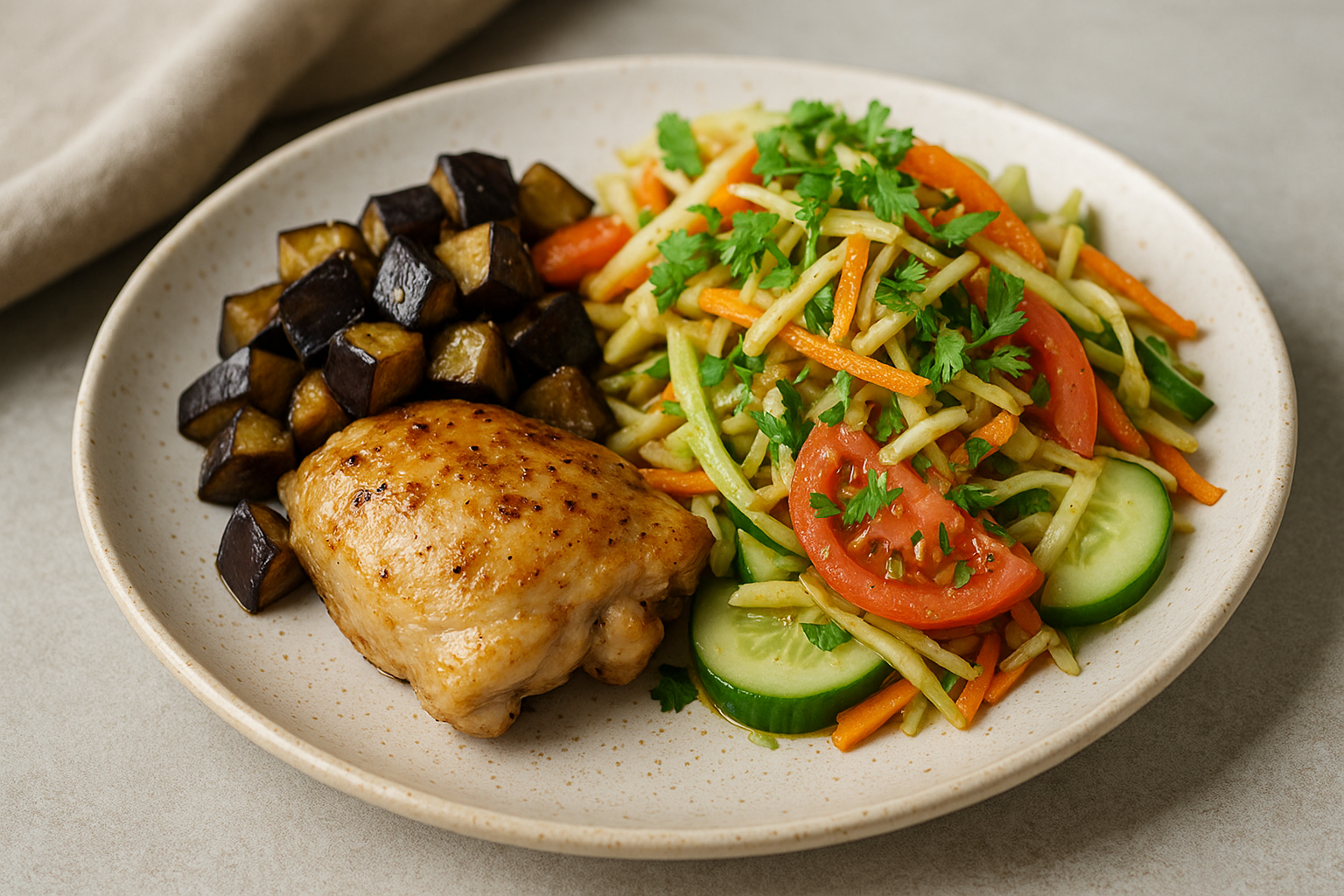 1.Prae tükeldatud kanakints kookosrasvas poolküpseks ja maitsesta soola ning pipraga. 2.Lisa pannile tükeldatud baklažaan ja jätka praadimist kuni kana on küps. 3.Tükelda kapsas, kurk ja porgand salatiks. 4.Lisa värskele salatile tomatipüree, kreekapähkliõli, hakitud roheline sibul ja maitsesta maitseainetega.