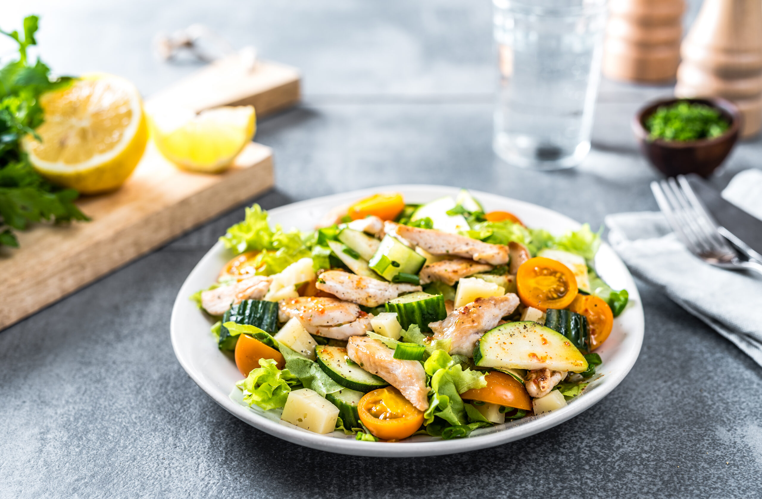 Tükelda tomatid, salat, kurk, sibul ja suvikõrvits ning sega kõik salatiks kokku. Tükelda ka juust.