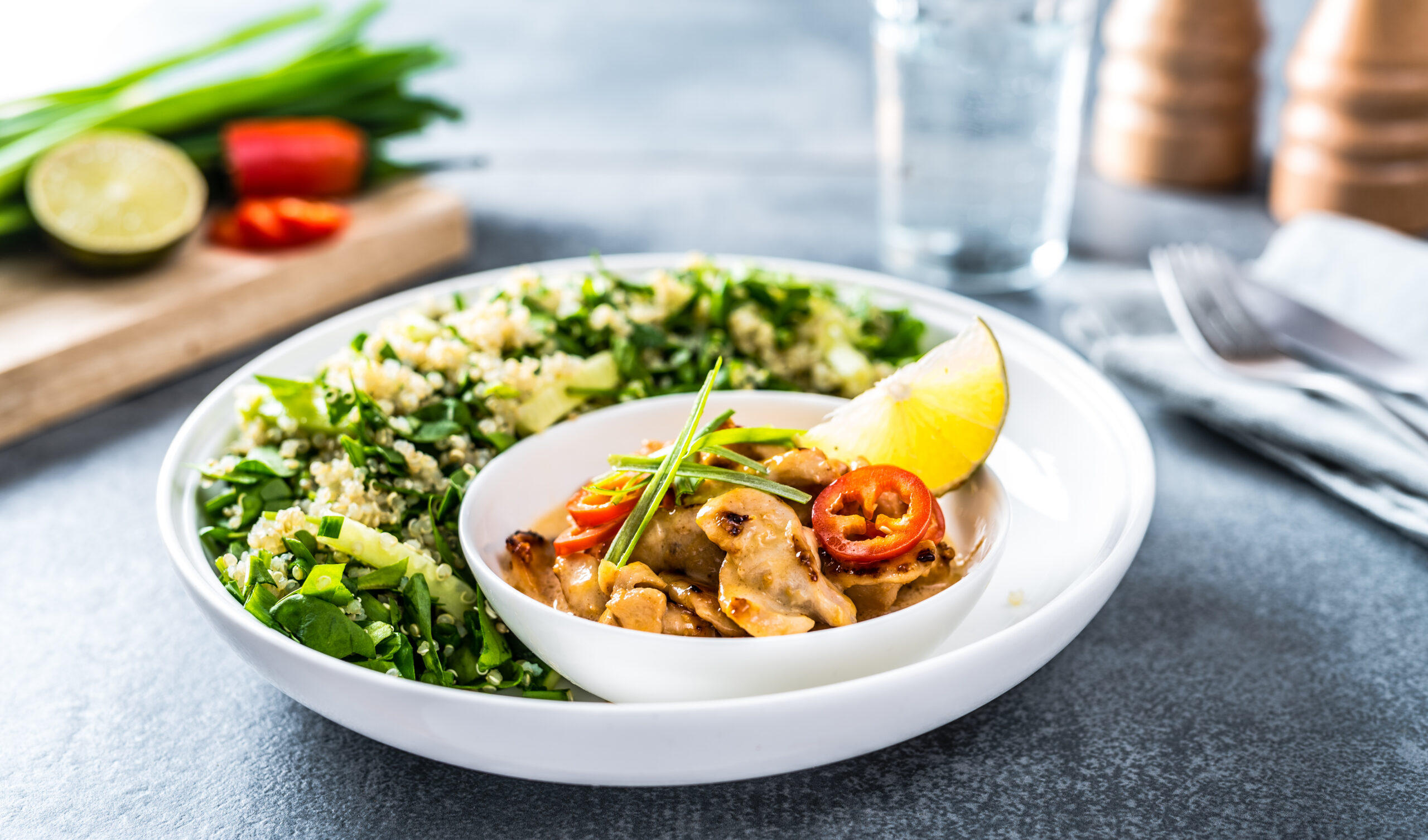 Selles roas on kana peamine täiskõhutunde looja, pakkudes palju valku väheste kaloritega. Kana kõrge valgusisaldus suurendab toidu termilist efekti, mis tähendab, et keha kulutab seedimiseks rohkem energiat. Kui lisad kõrvale köögivilju või kerge süsivesikute allika, saad tasakaalus roa, mis sobib hästi kaalulangetuse menüüsse.