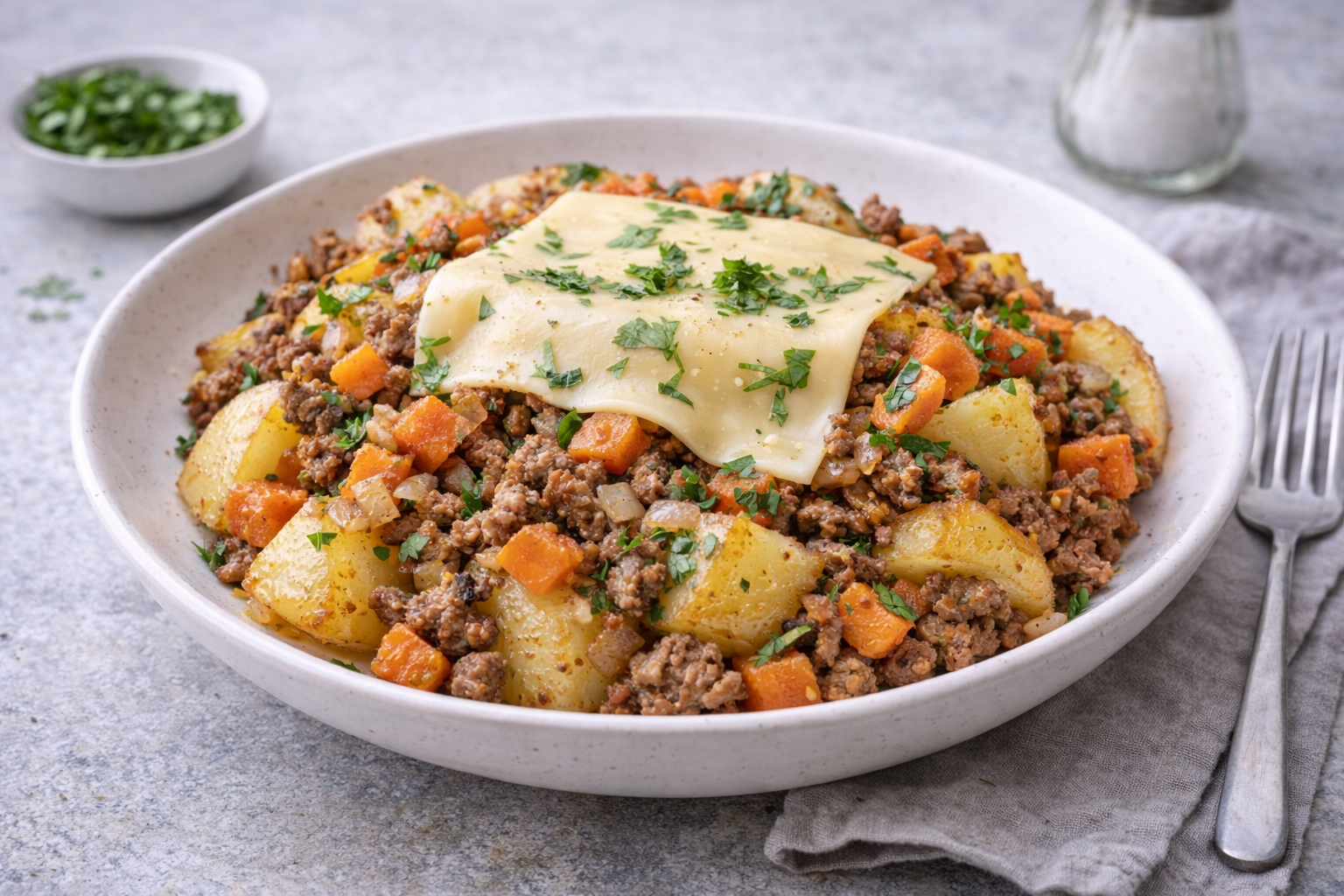 Keedetud praekartul hakkliha ja köögiviljadega on toekas ja nostalgiline kodune roog, mis pakub head tasakaalu süsivesikute, valkude ja rasvade vahel. Kartuli eelnev keetmine teeb roa seedimisele kergemaks, hakkliha annab täiskõhutunde ning praetud porgand ja sibul lisavad loomulikku magusust. Juustuviil sulab kuuma roa peale mõnusalt ning koriander annab roale värske ja kergelt idamaise nüansi.