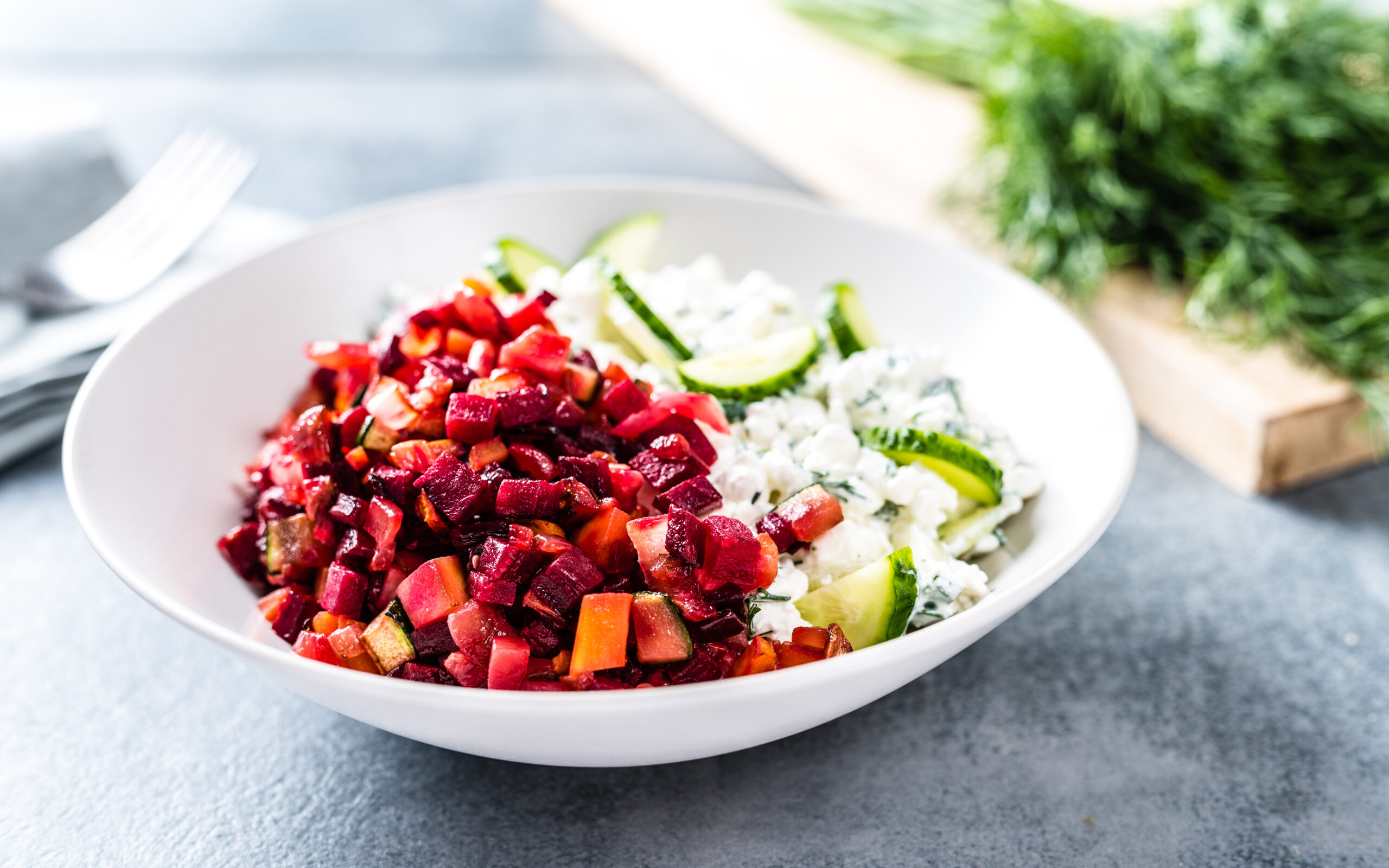 Serveeri küpsetatud juurviljad kodujuustusalati ja hapukoorega.