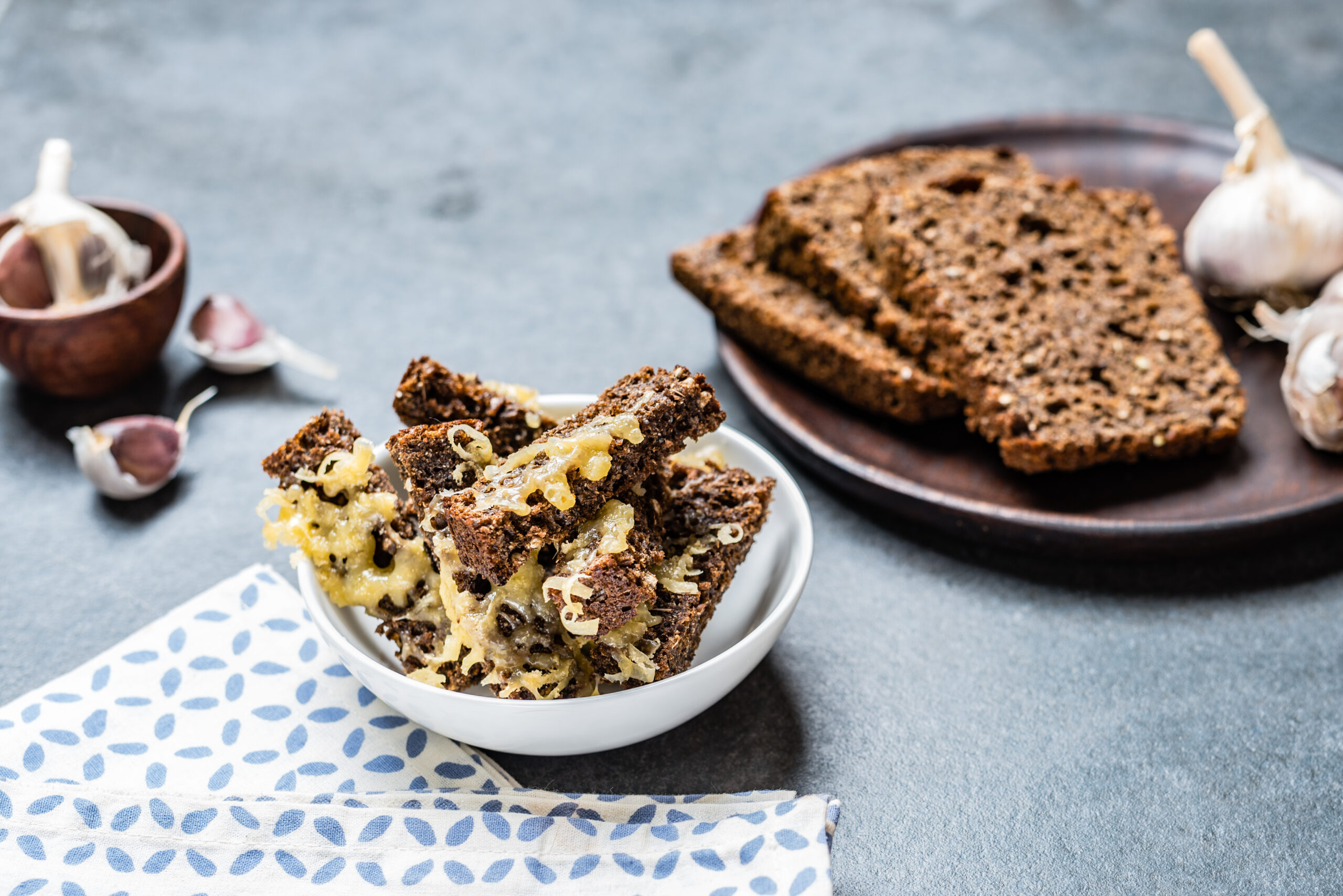 Lõika röstitud leib ampsusuurusteks tükkideks ja serveeri koos küüslaugu-juustudipiga.