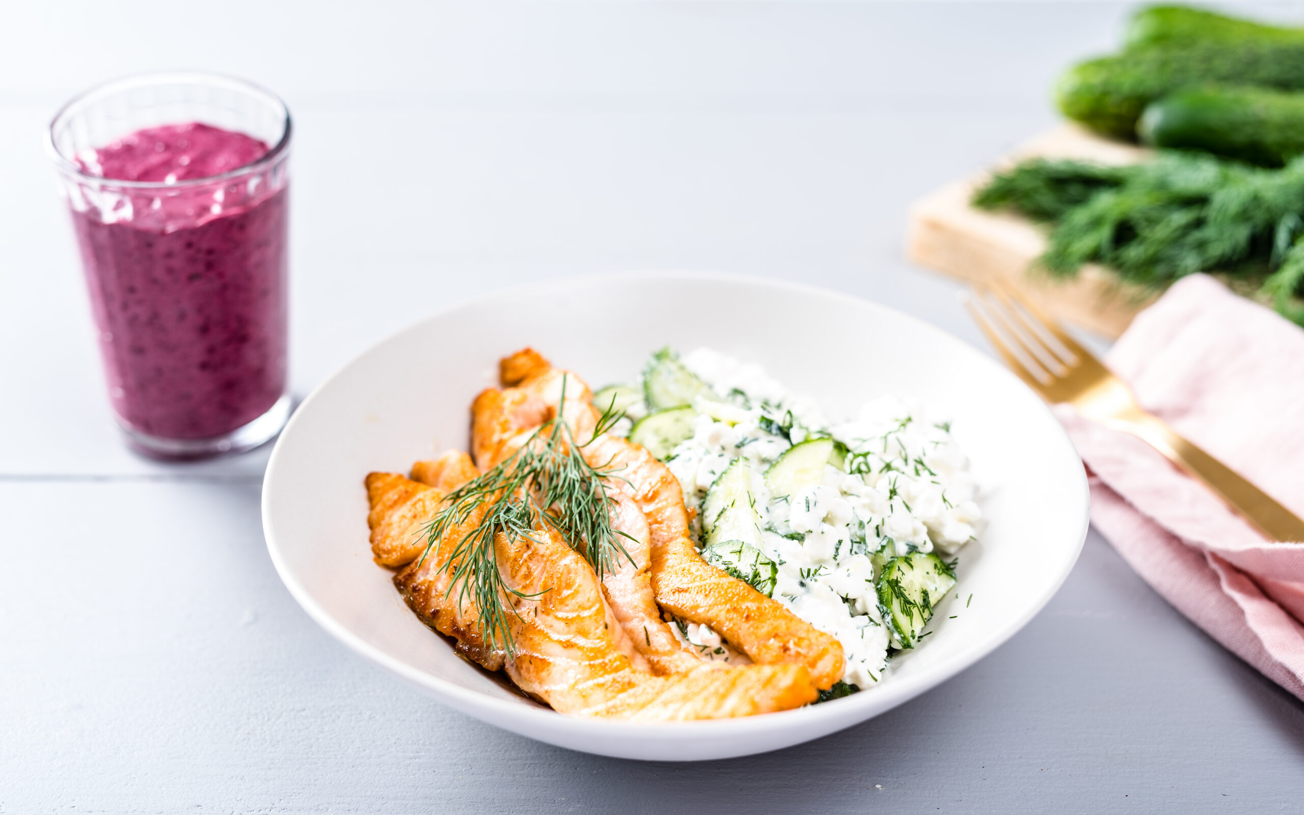 Serveeri lõhe kodujuustusalatiga, magustoiduks joo kamasmuuti.