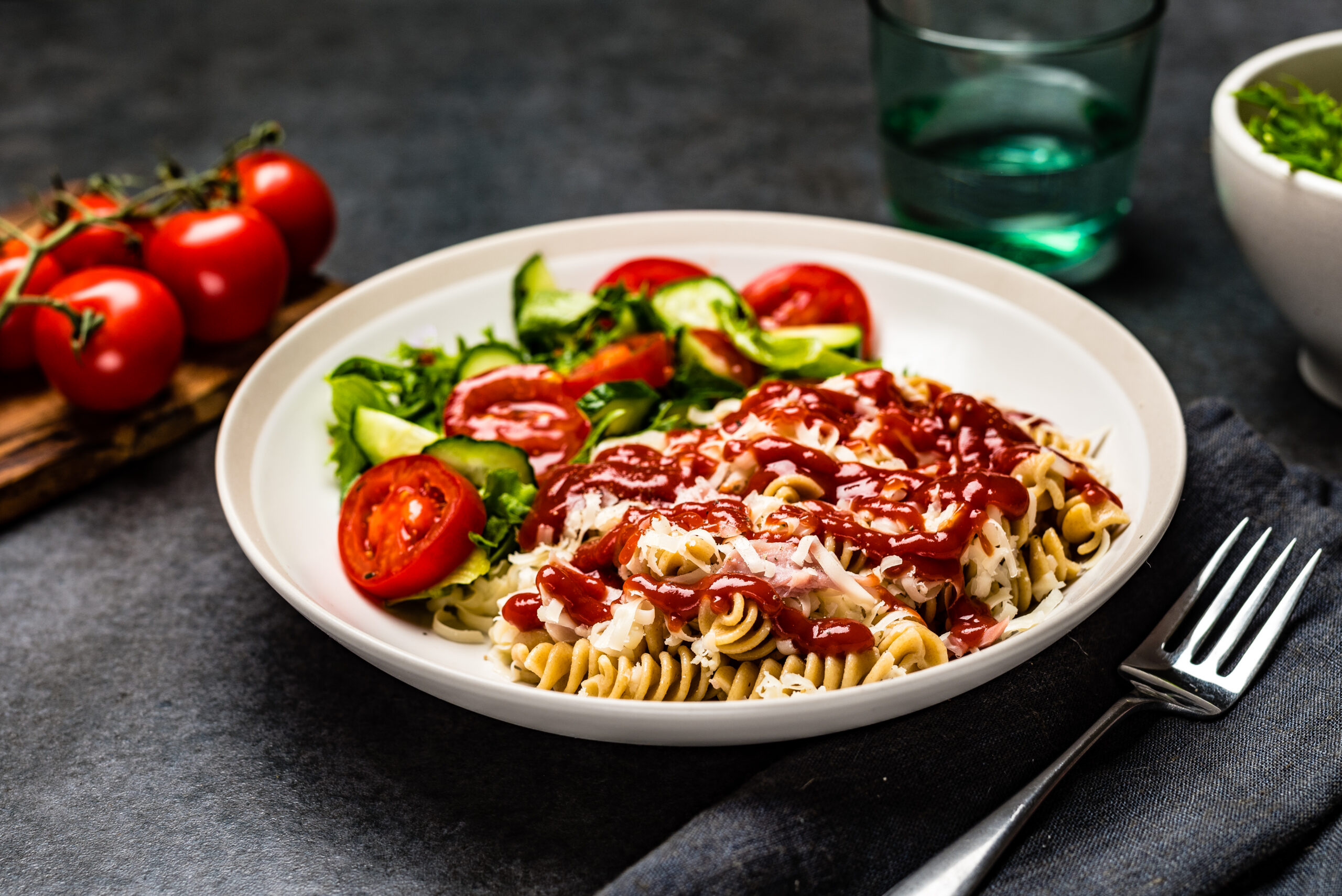 5. Serveeri pasta- raputa peale riivitud juust, kastmeks ketšup ja kõrvale salat.