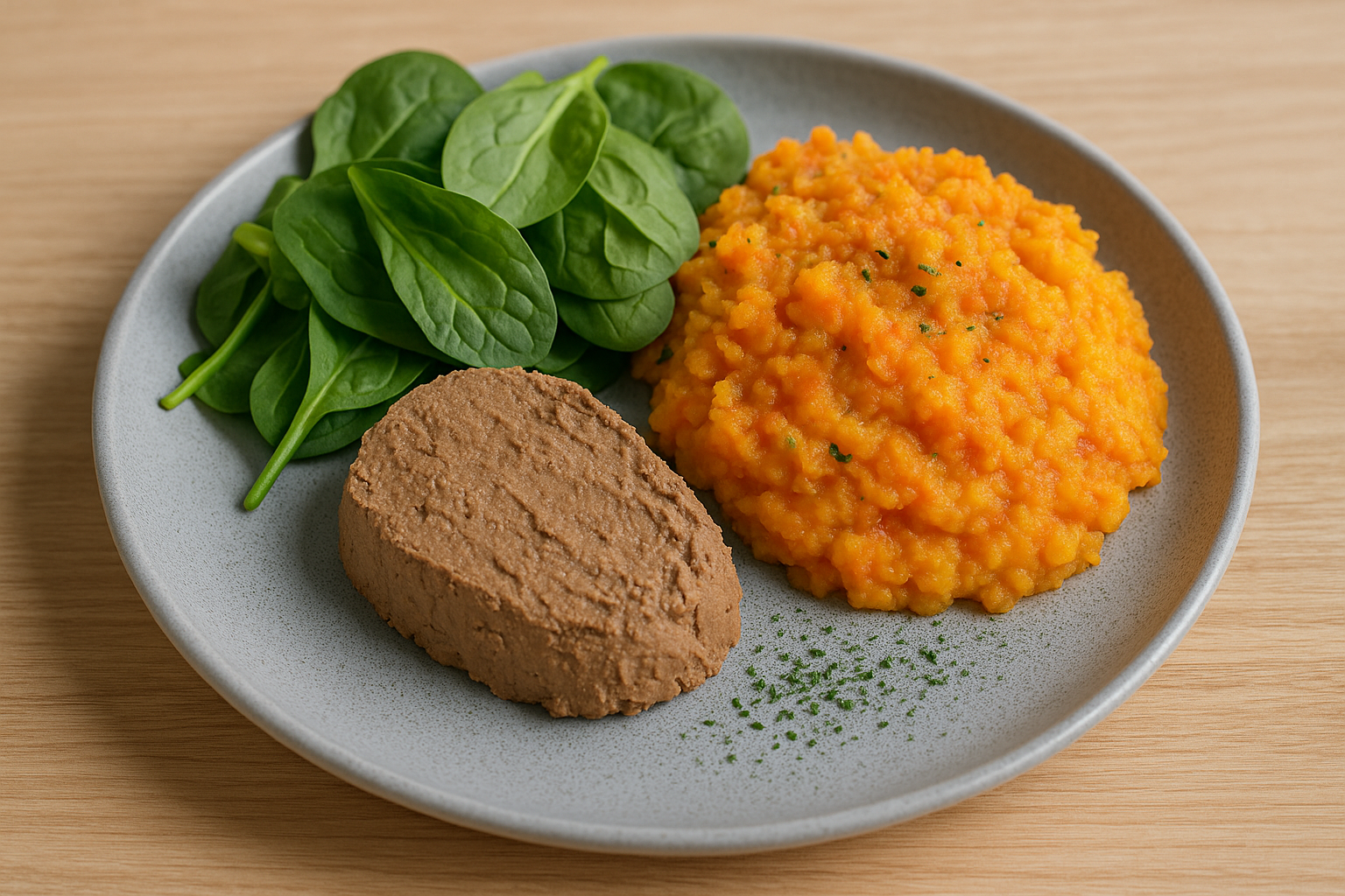 Serveeri maksapasteeti koos porgandi-kartulipüree ja värske spinatiga.