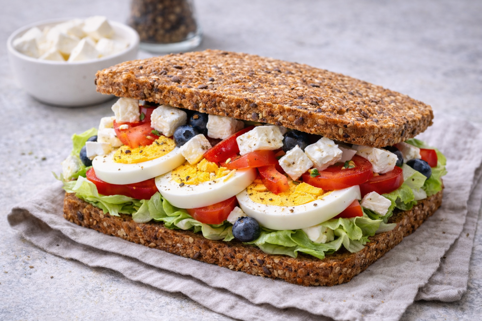 Munavõileib fetajuustu ja värskete köögiviljadega on toitev ja maitsekas eine, mis sobib hästi nii hommiku- kui lõunasöögiks. Munast ja fetajuustust saadav valk hoiab kõhu täis, köögiviljad lisavad värskust ja kiudaineid ning koorikleib annab püsiva energia. Marjad ei ole klassikaline võileivakomponent, kuid väike kogus lisab värskust, antioksüdante ja visuaalset kontrasti, sobides hästi feta soolasusega.