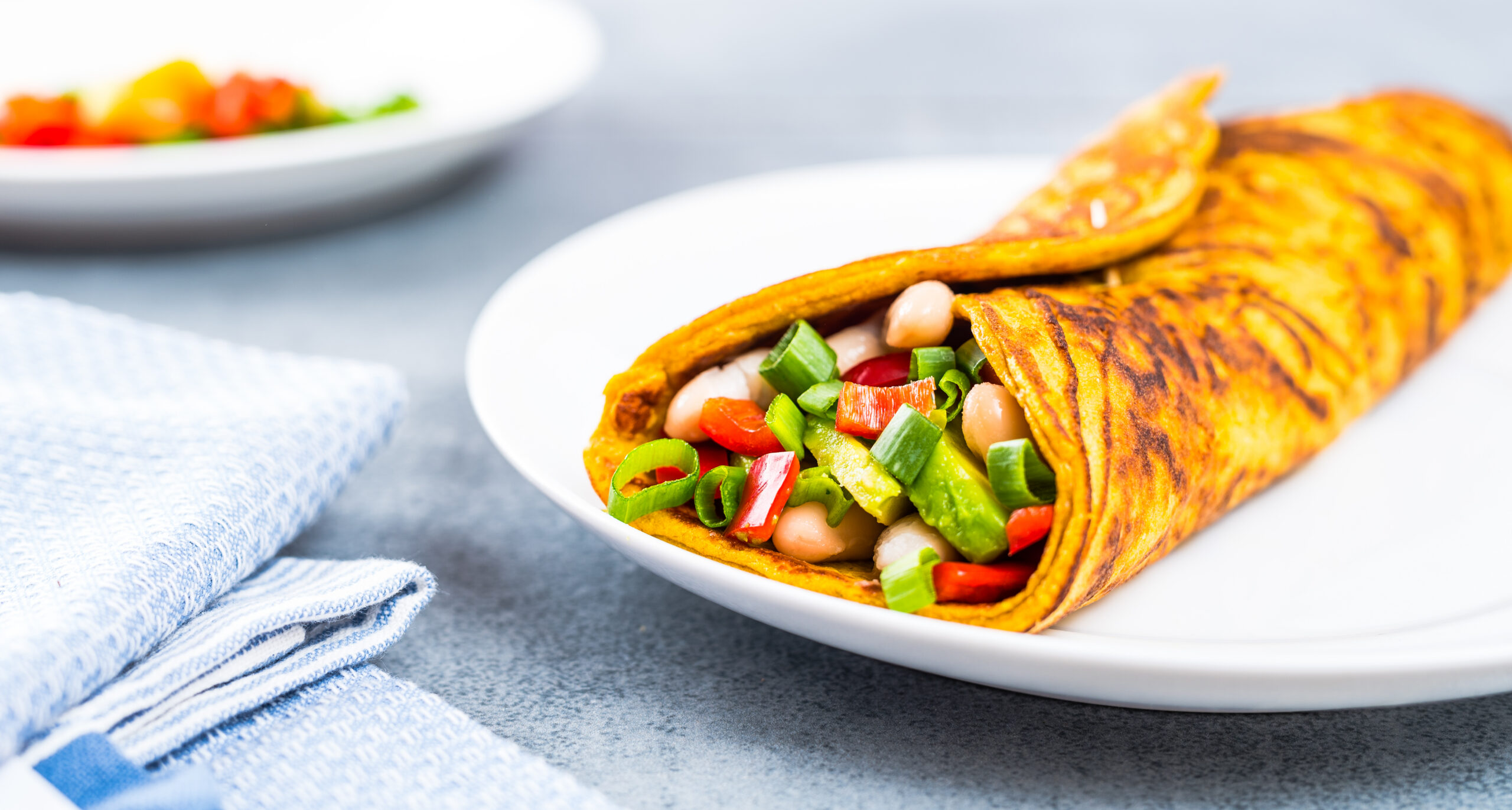 4. Pane paprika, roheline sibul, avokaado ja oad pannkoogi sisse ning keera ettevaatlikult rulli.