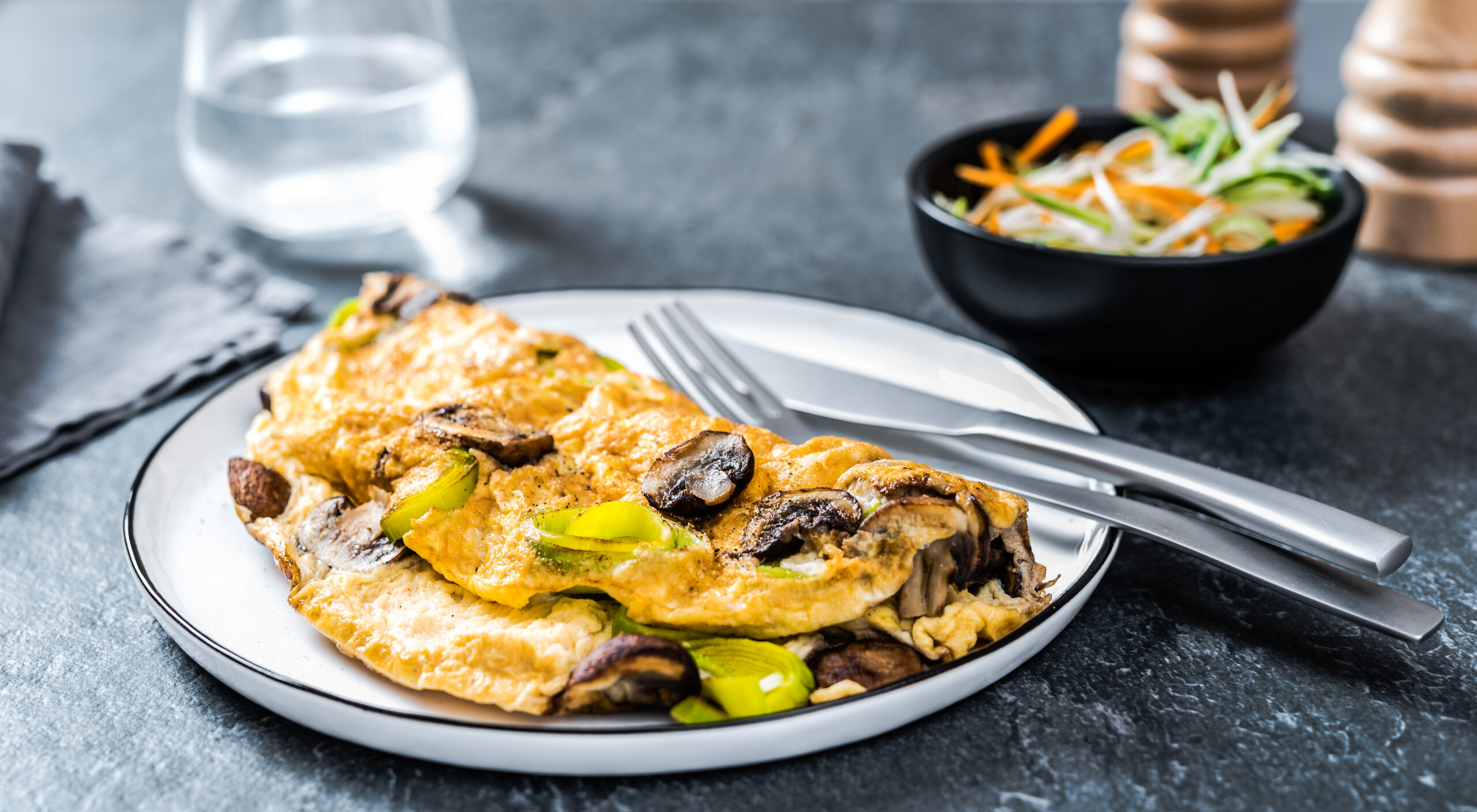 Prae seeni ja porrut kuumal pannil. Seejärel lisa pannile ka munasegu. Vajadusel kuumuta omletti mõlemalt poolt, kuni muna on hüübinud.