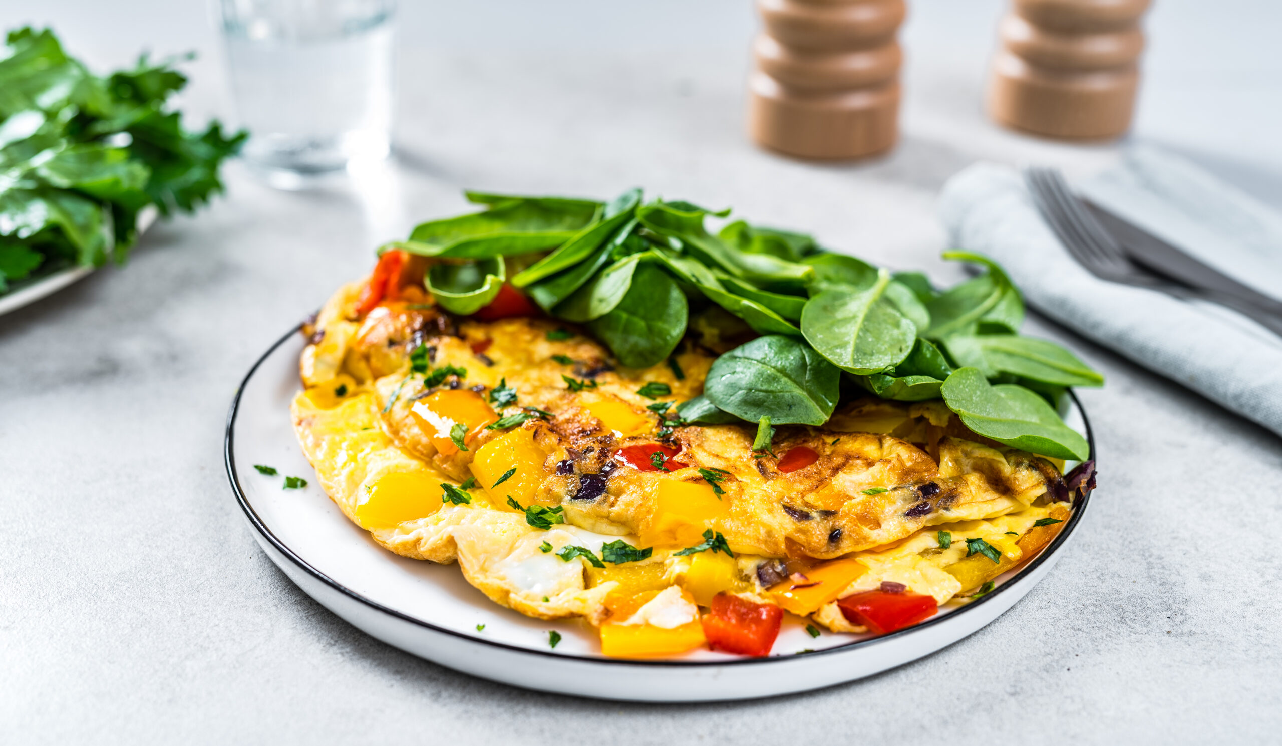 Omlett spinati ja paprikaga keskmes on munad, mis on looduslikult valgurikkad ja väga hästi omastatavad. Munast saadav valk toetab lihaste säilimist, mis on eriti oluline, kui vähendad kaloreid. Koos köögiviljade või kergete lisanditega on tegu hommiku- või lõunasöögiga, mis aitab sul lihtsamini kaloridefitsiidis püsida.