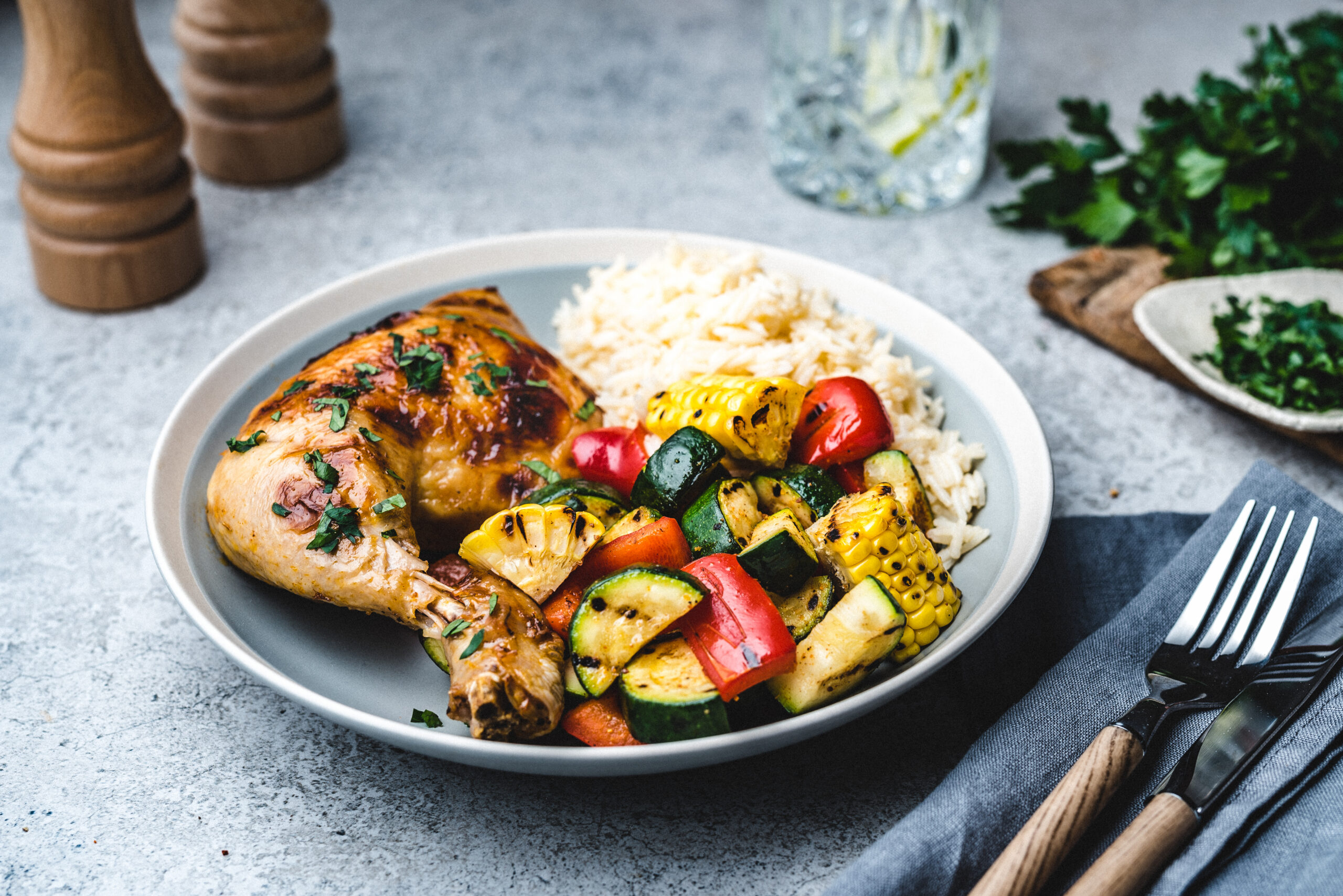 Raputa kanale tükeldatud petersell ja serveeri riisi ja köögiviljadega, leem mis kana küpsetamisest tekkis sobib ideaalselt riisi maitsestamiseks.