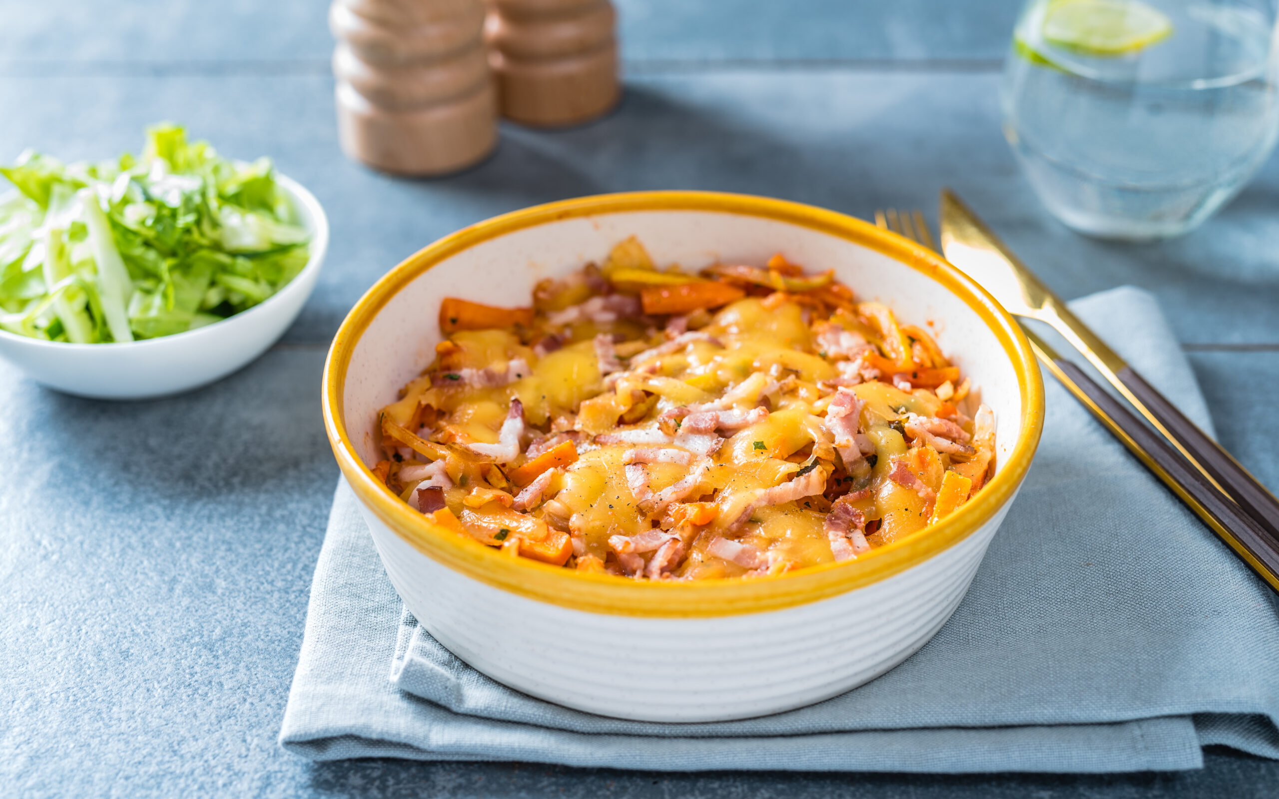 Võta vorm ahjust jälle välja ning raputa peale riivitud juust ja peekon. Pane vorm ahju ja küpseta veel umbes 5 minutit.