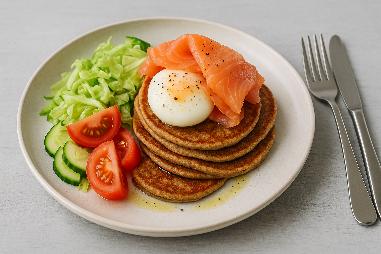 tee taldrikule jääsalatist „padi“, aseta peale soojad pliinid, siis muna ja kõige peale lõhe. nirista peale 3 g oliiviõli, maitsesta soola ja musta pipraga (Santa Maria).