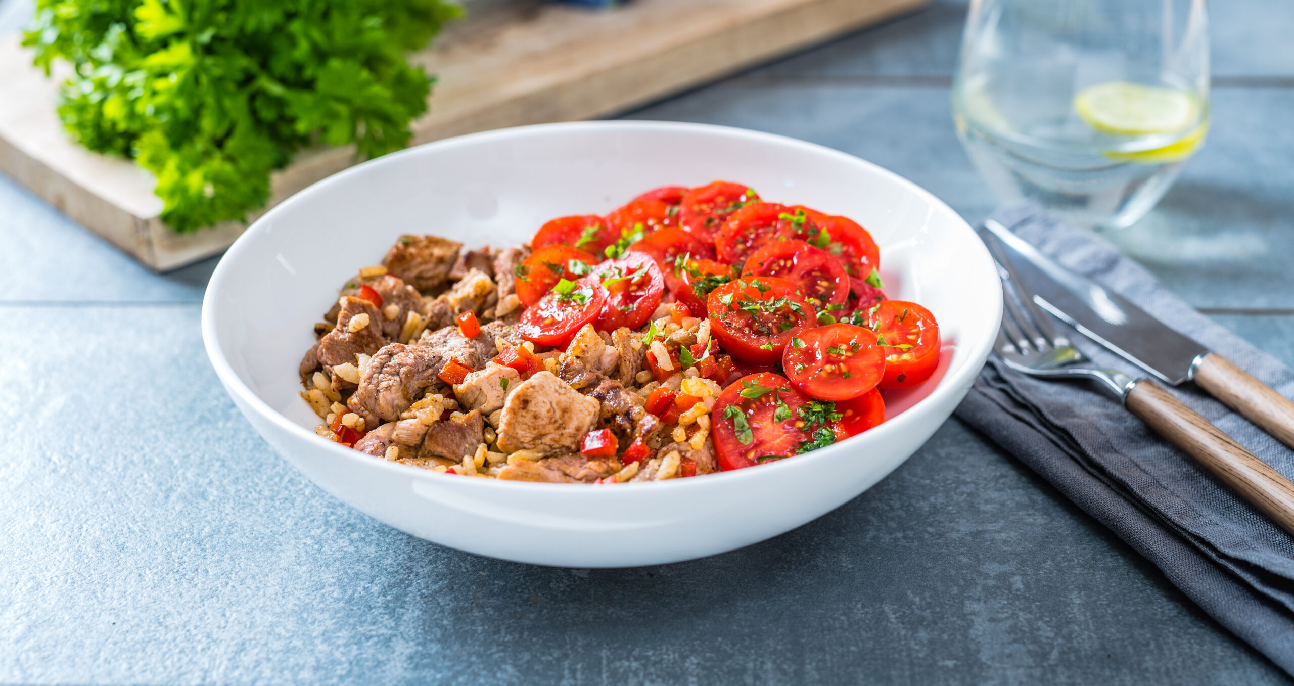 3. Tükelda sealiha ja paprika, lõika tomat viiludeks ning haki petersell.