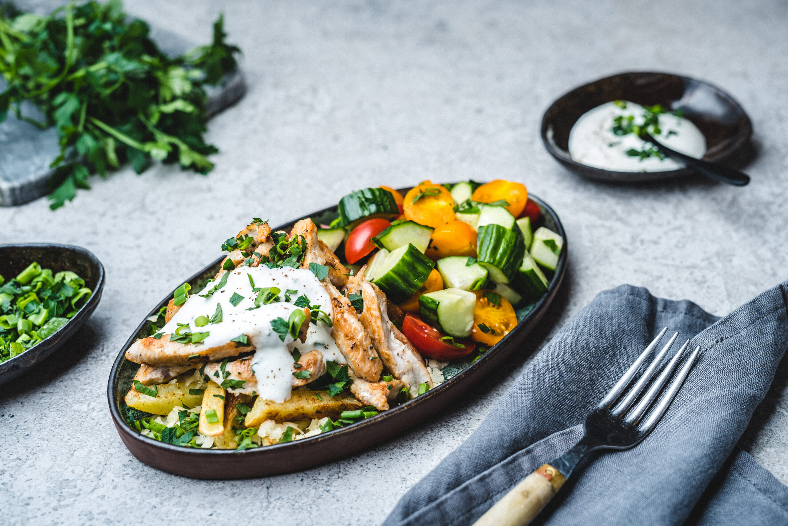 Serveeri: tõsta taldrikule kartulid, raputa peale juust, lisa kana, maitseroheline ja hapukoor; serveeri kõrvale salat.