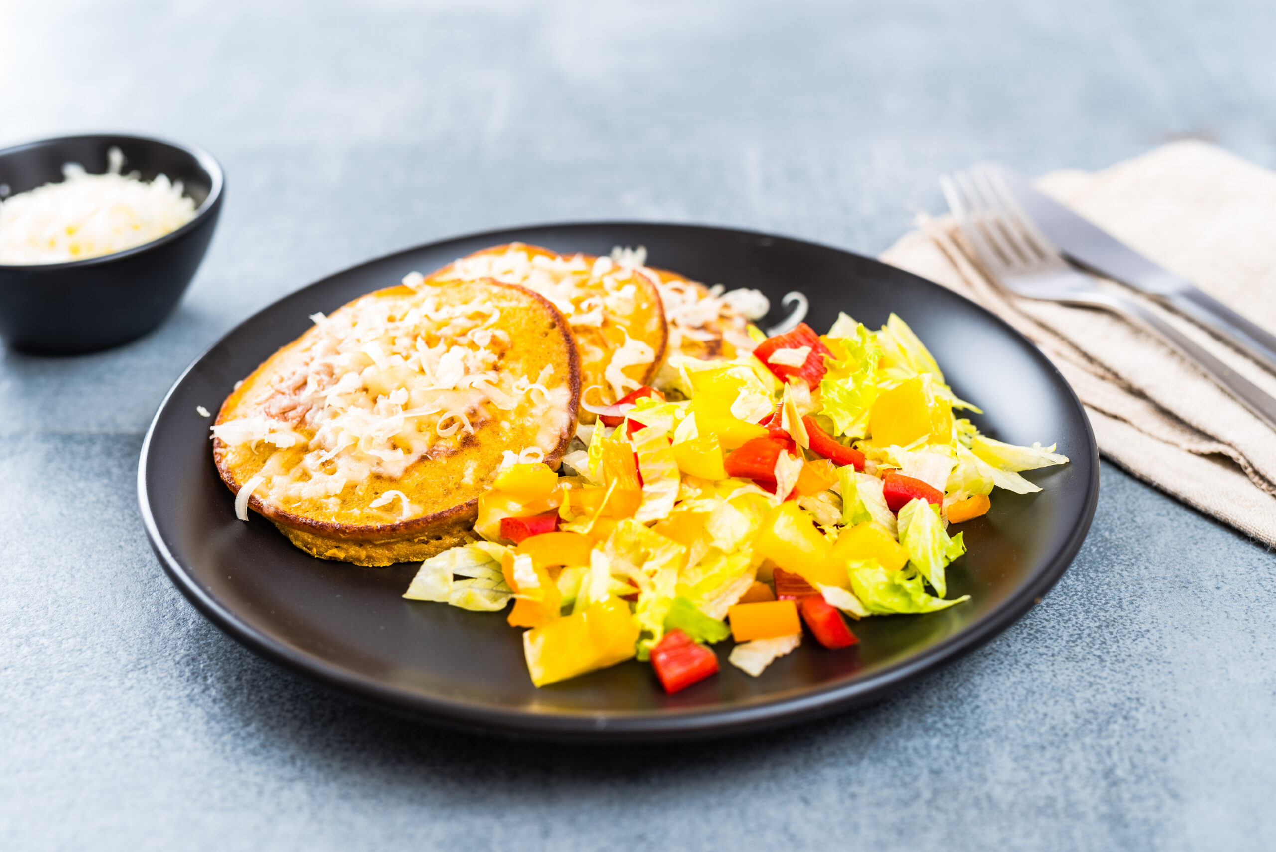 5. Serveeri juustuga kaetud bataadipannkoogid värske salatiga.
