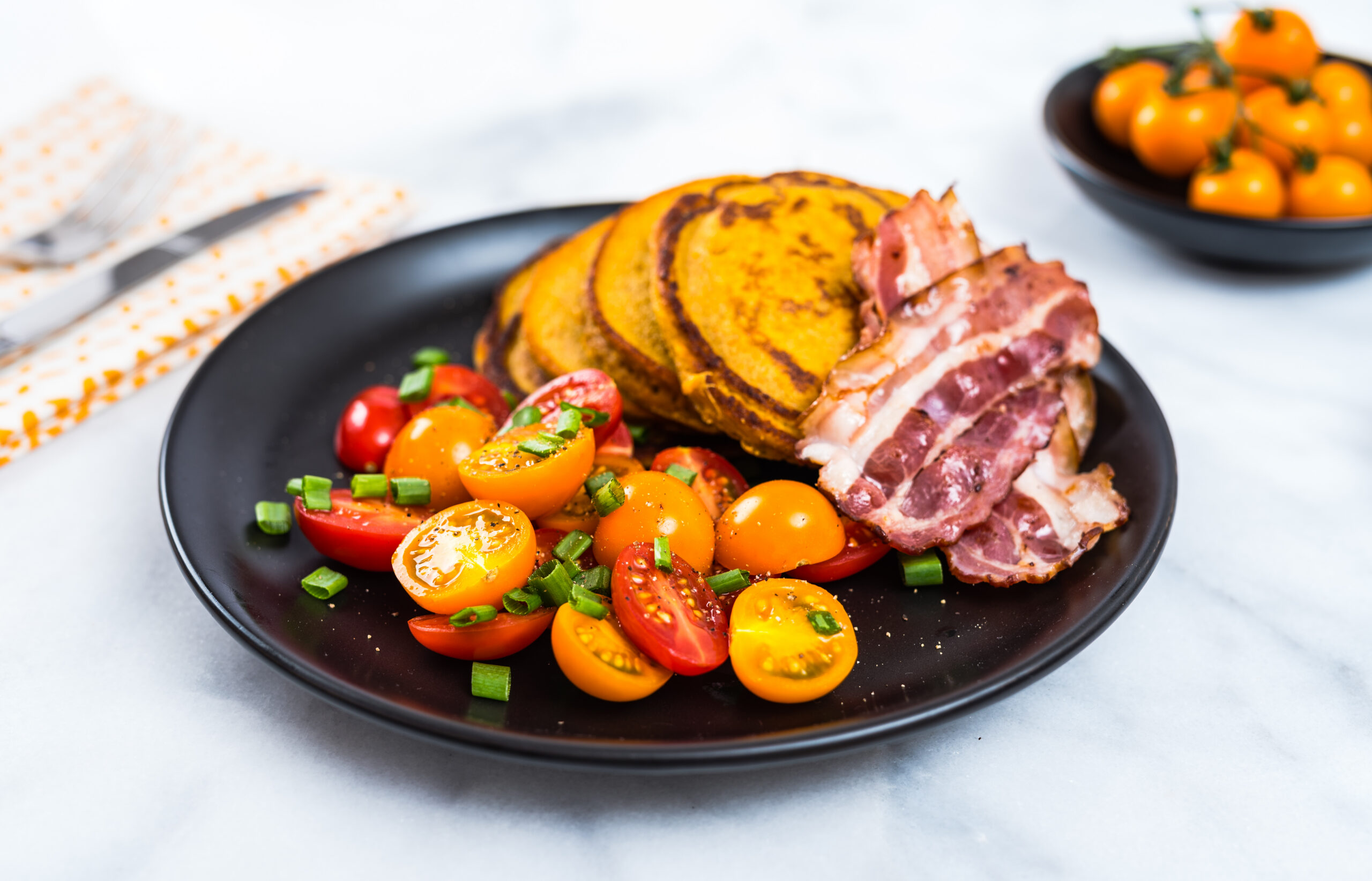 Serveeri bataadipannkoogid peekoni ja värske salatiga.