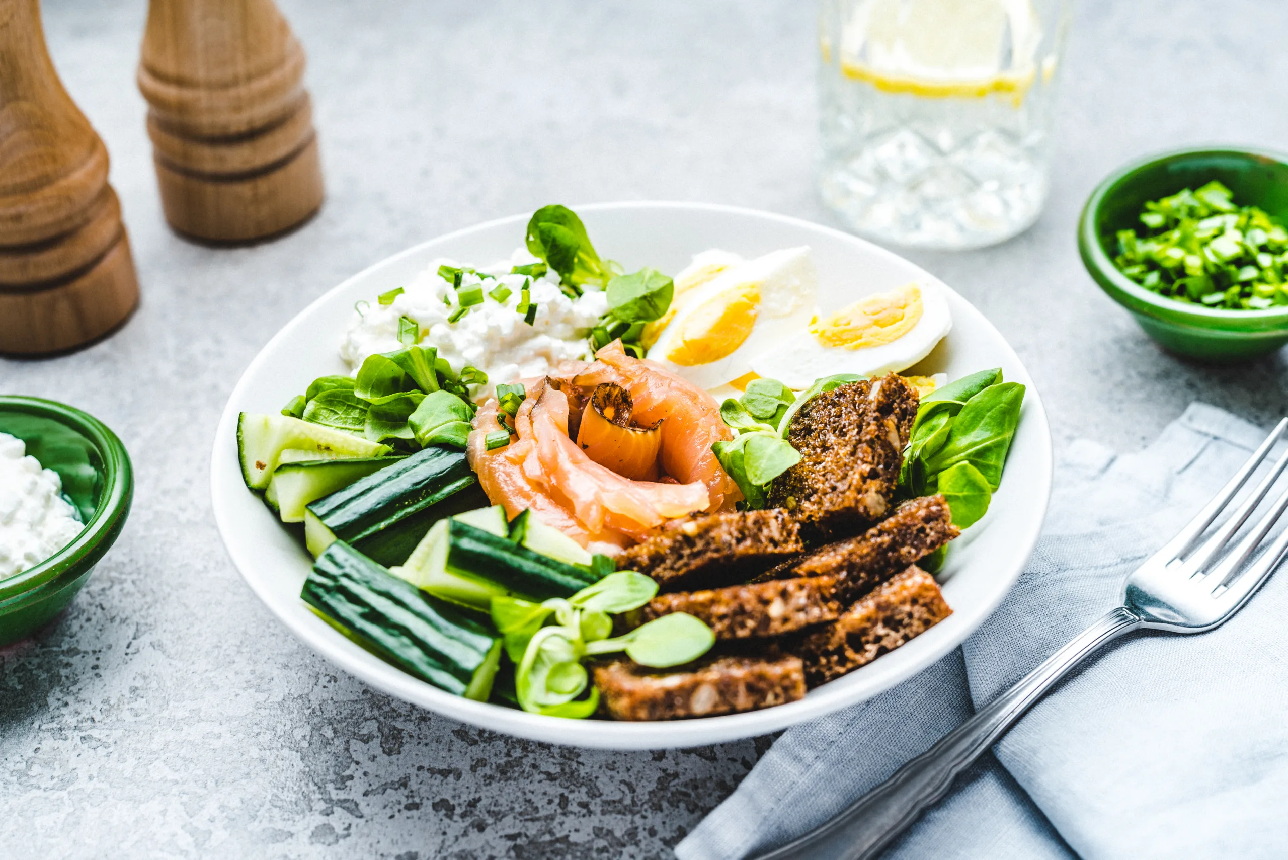 Tee suitsulõhest roos, maitsesta sidrunipipraga ja pane kaussi salatipadjale, kõrvale aseta kodujuust, leib ja kurk ning raputa peale maitseroheline, serveeri.