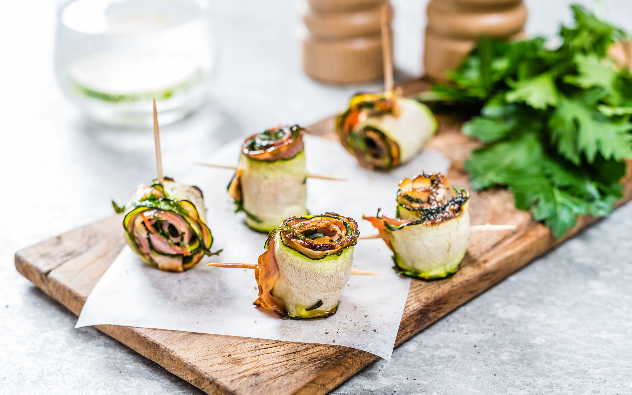 Lõika suvikõrvitsast pikkupidi õhukesed viilud, tee sama peekoniga, haki petersell.