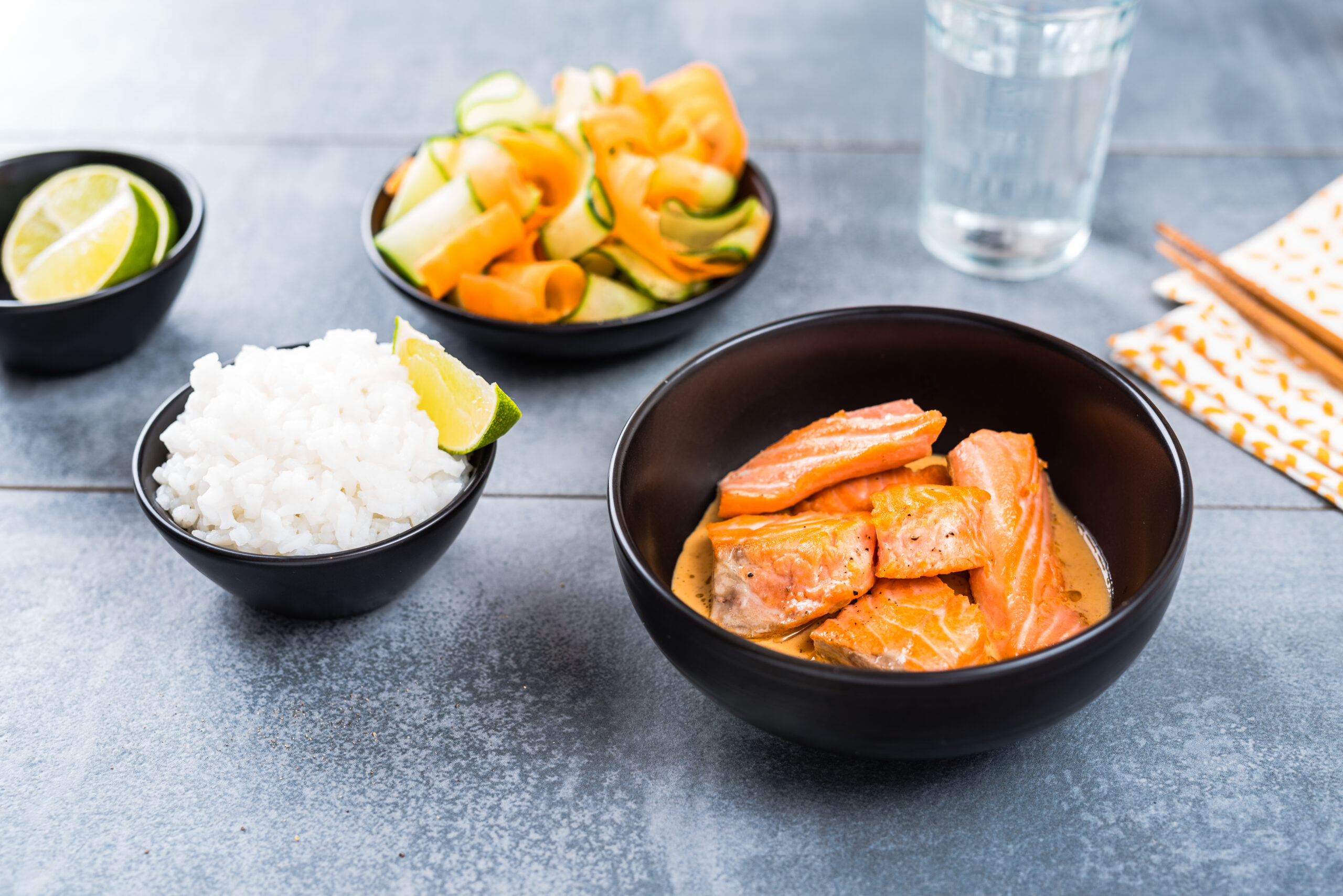 Tõsta lõhe tükid pannile ja prae 3-4 minutit. Maitsesta soolaga. Seejärel lisa karripasta (1-2tl serveeringu kohta) ja prae veel 2 minutit. Lisa kookospiim (100ml serveeringu kohta), maitseained, värskelt pressitud laimimahl, kalakaste (maitse järgi) ning sega hoolikalt ja jäta tasasele tulele 5 minutiks.