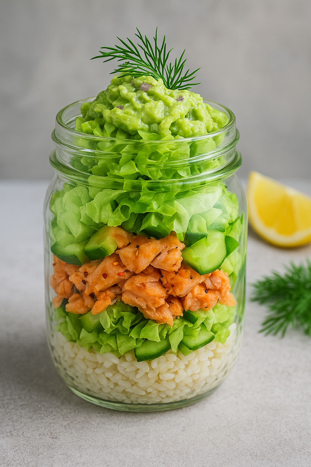 Lao kõik kihiti klaaspurki või kaussi: alumiseks kihiks riis, siis lõhe, seejärel kurk ja salat, peal avokaado-sibula segu. Soovi korral kaunista värske tilli või murulauguga.