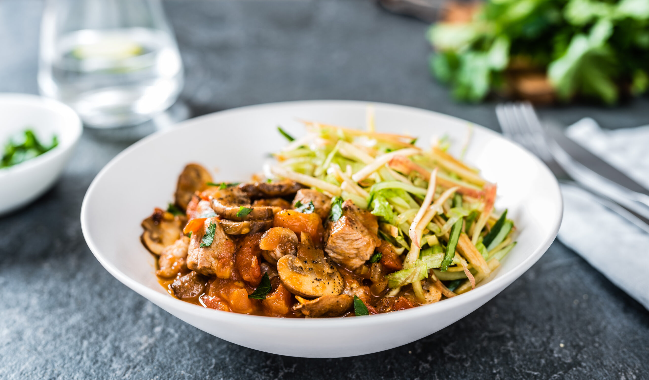 Prae liha ühtlaselt pruuniks ning lisa siis seened, tomat, sibul ja maitseained. Keera kuumus maha ja jäta mõneks minutiks kaane alla hauduma.
