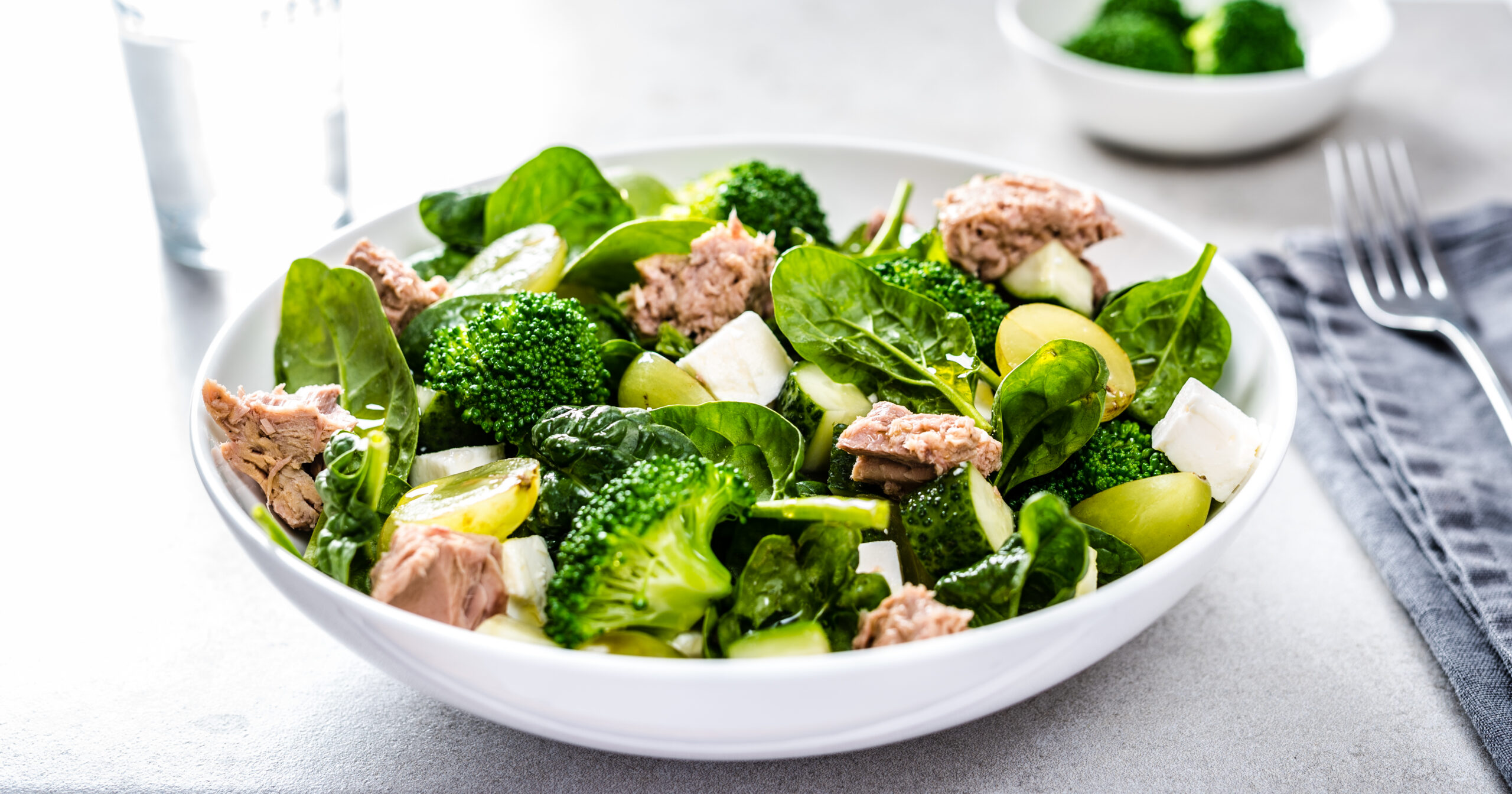 Sega kokku brokoli, kurk, spinat, viinamarjad, feta juust, tuunikala ja oliiviõli. NB! Selle salati võid ka salatisaarel kokku panna.