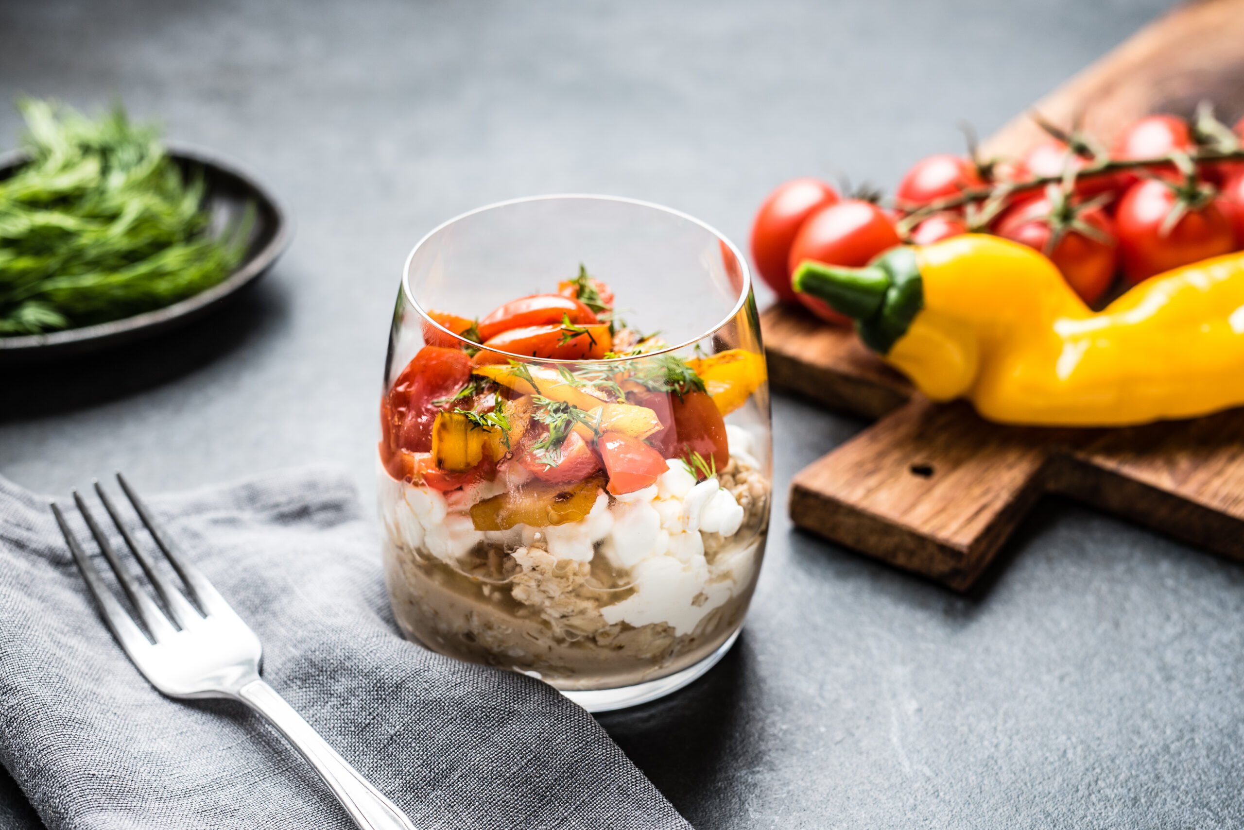 Tükelda paprika, tomat ja maitseroheline ning sega kodujuustuga.
