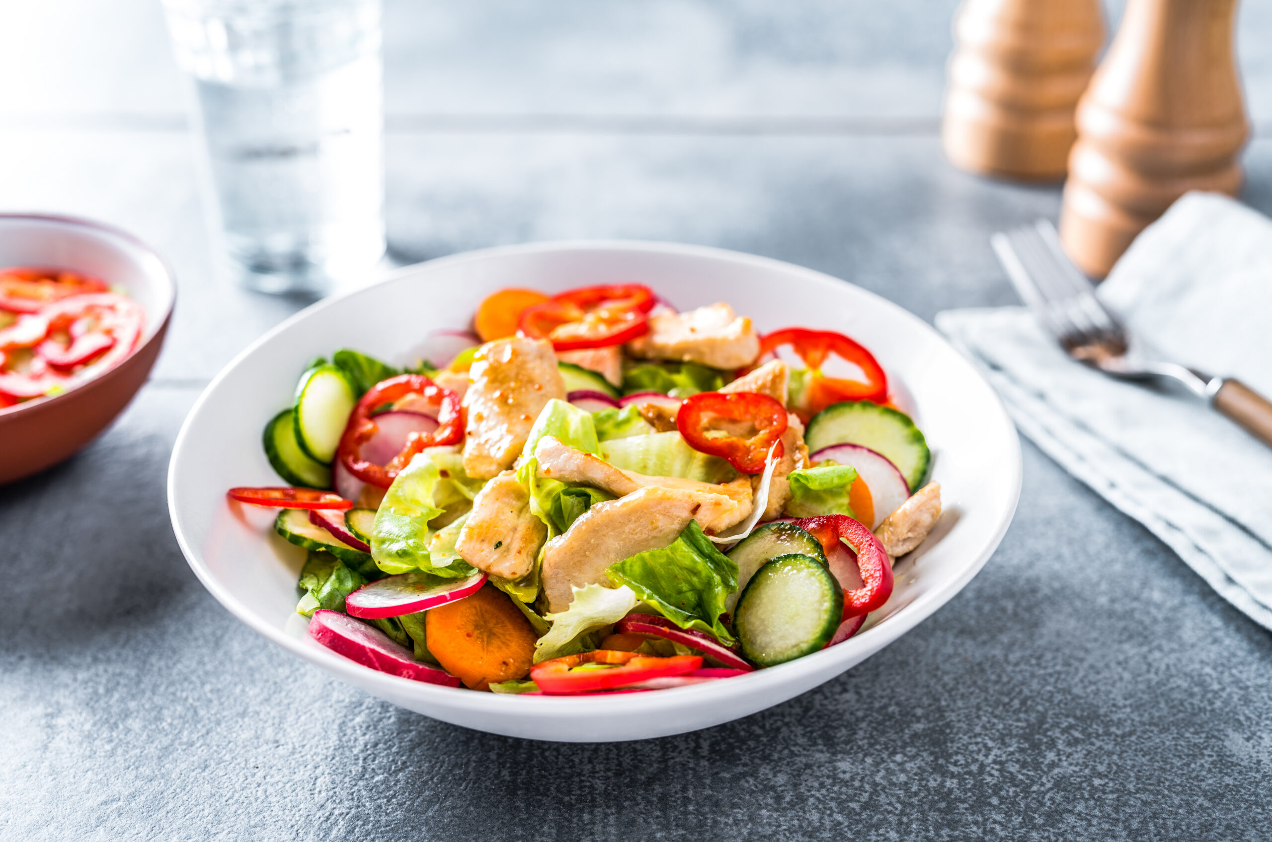 Laota tükeldatud köögiviljad taldrikule, aseta peale kana tükid ning nirista kaste ühtlaselt salatile.