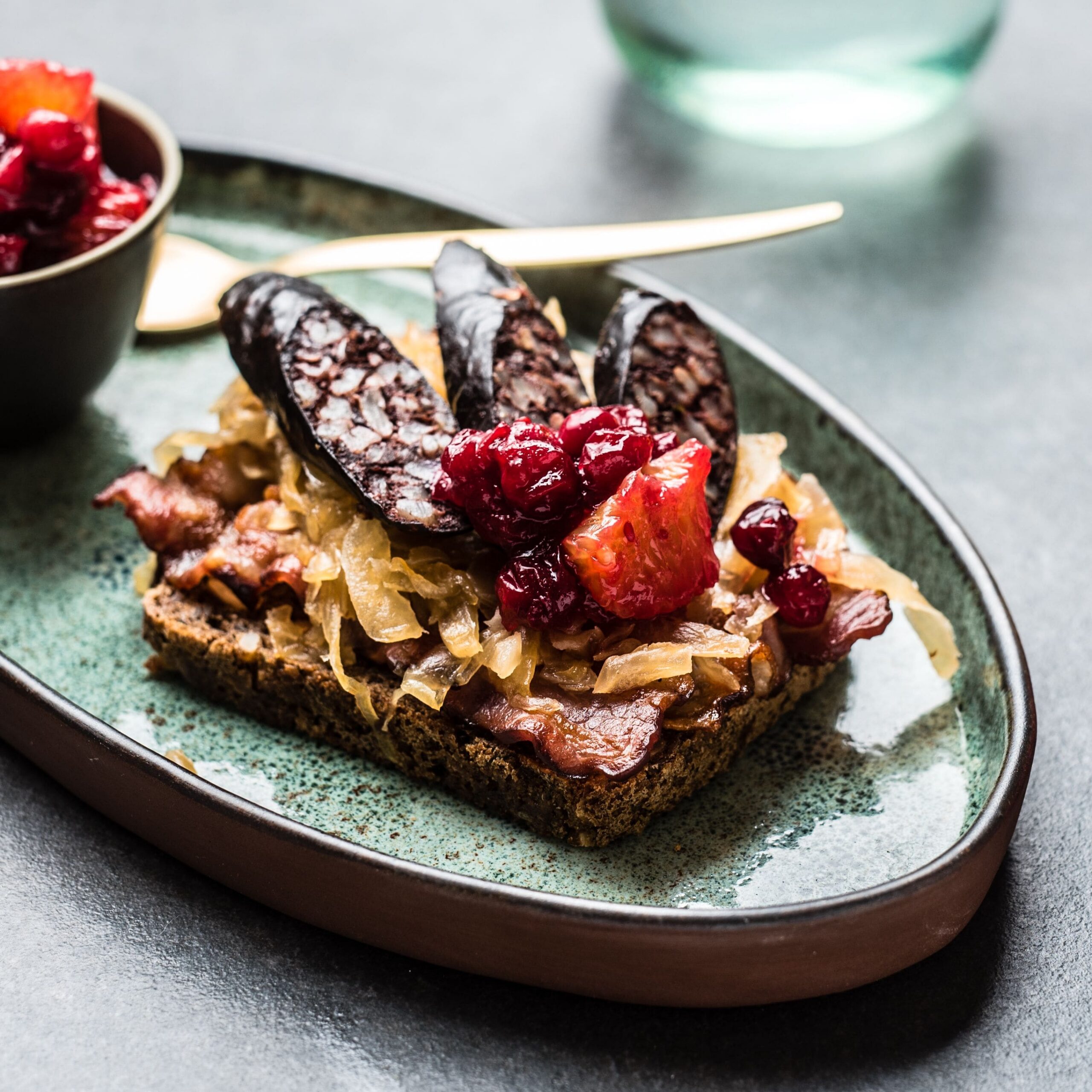 Aseta leivale peekon, seejärel praekapsas, siis verivorsti viilud ning kõige peale jõhvikakaste.
