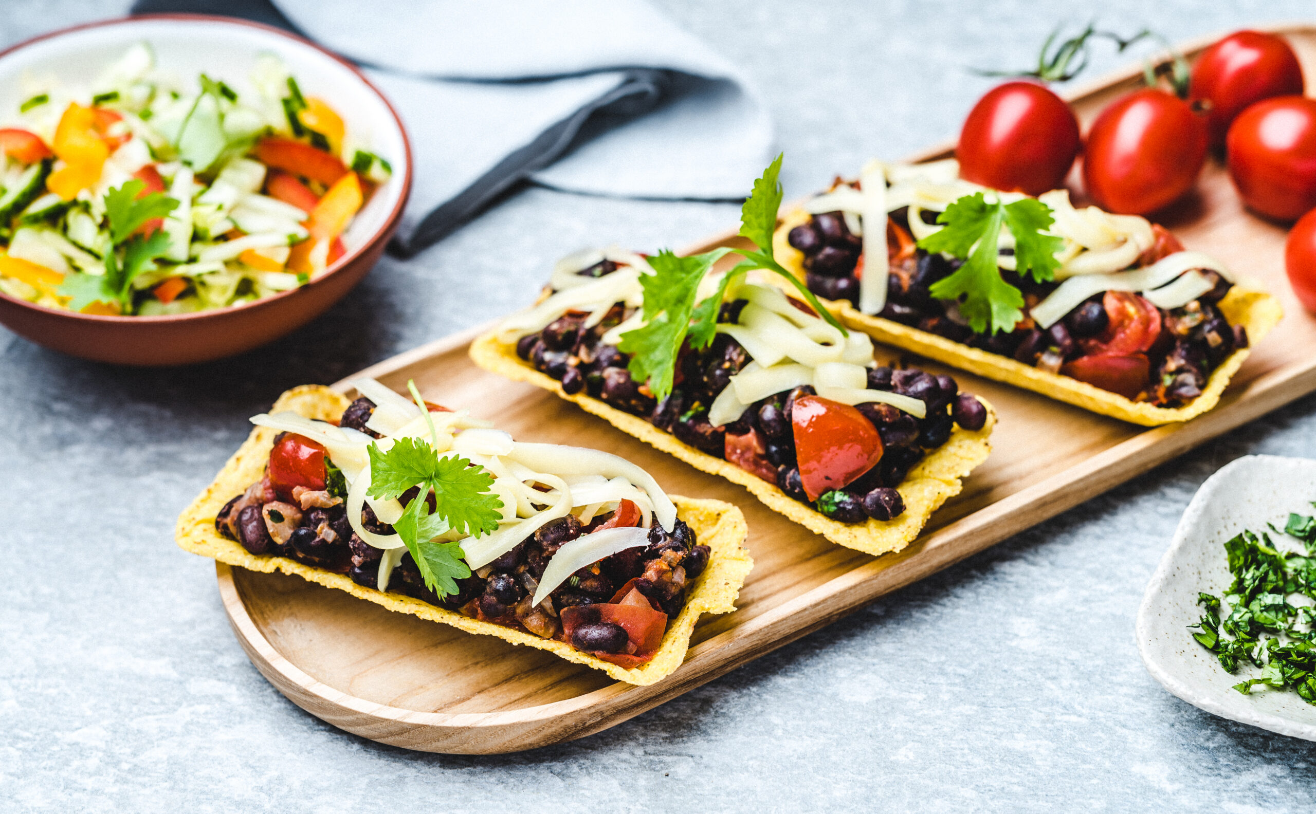 Pane oa-tomati segu tacokaussi, raputa peale riivitud juust ja serveeri salatiga