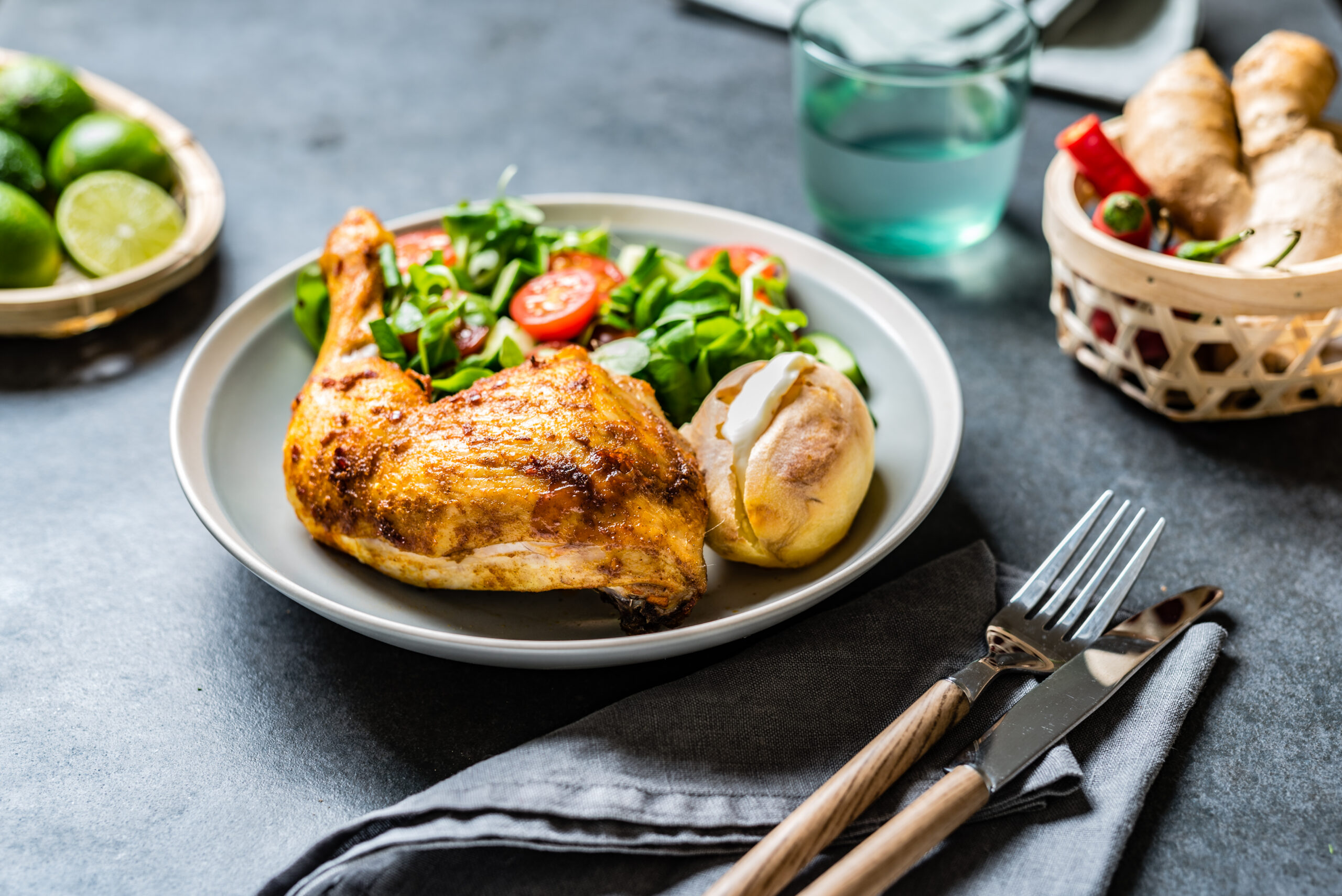 6. Serveeri vürtsikas ahjukana toorjuustuga täidetud kartulite ja värske salatiga.