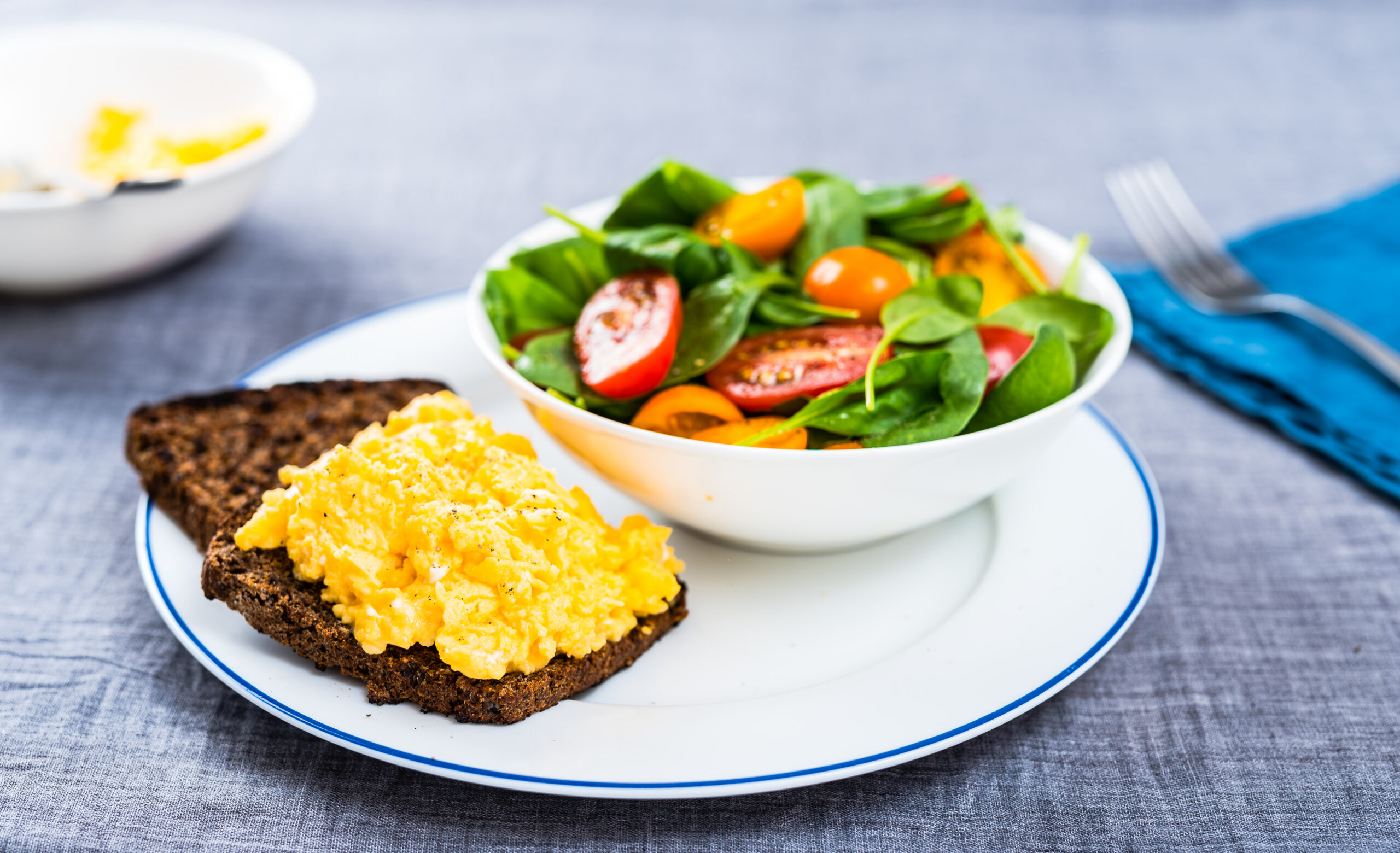 5. Serveeri munapuder leival ja kõrvale spinati-tomati salat.