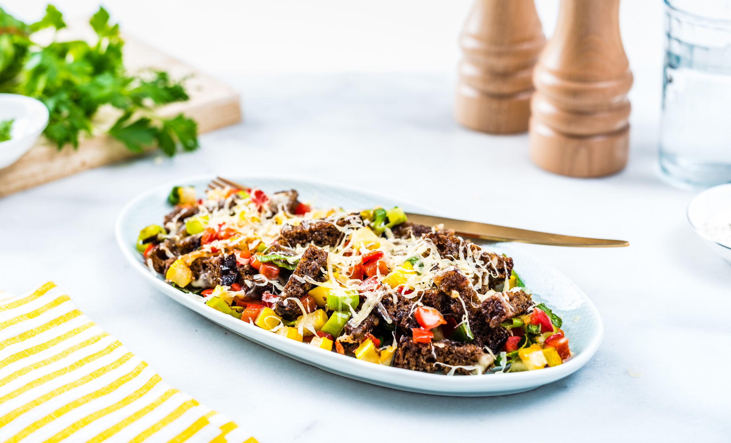 3. Prae leib pannil krõbedaks. Seejärel lisa pannile ka suvikõrvits, paprika ja roheline sibul. Prae veel mõni minut ning keera siis kuumus maha.