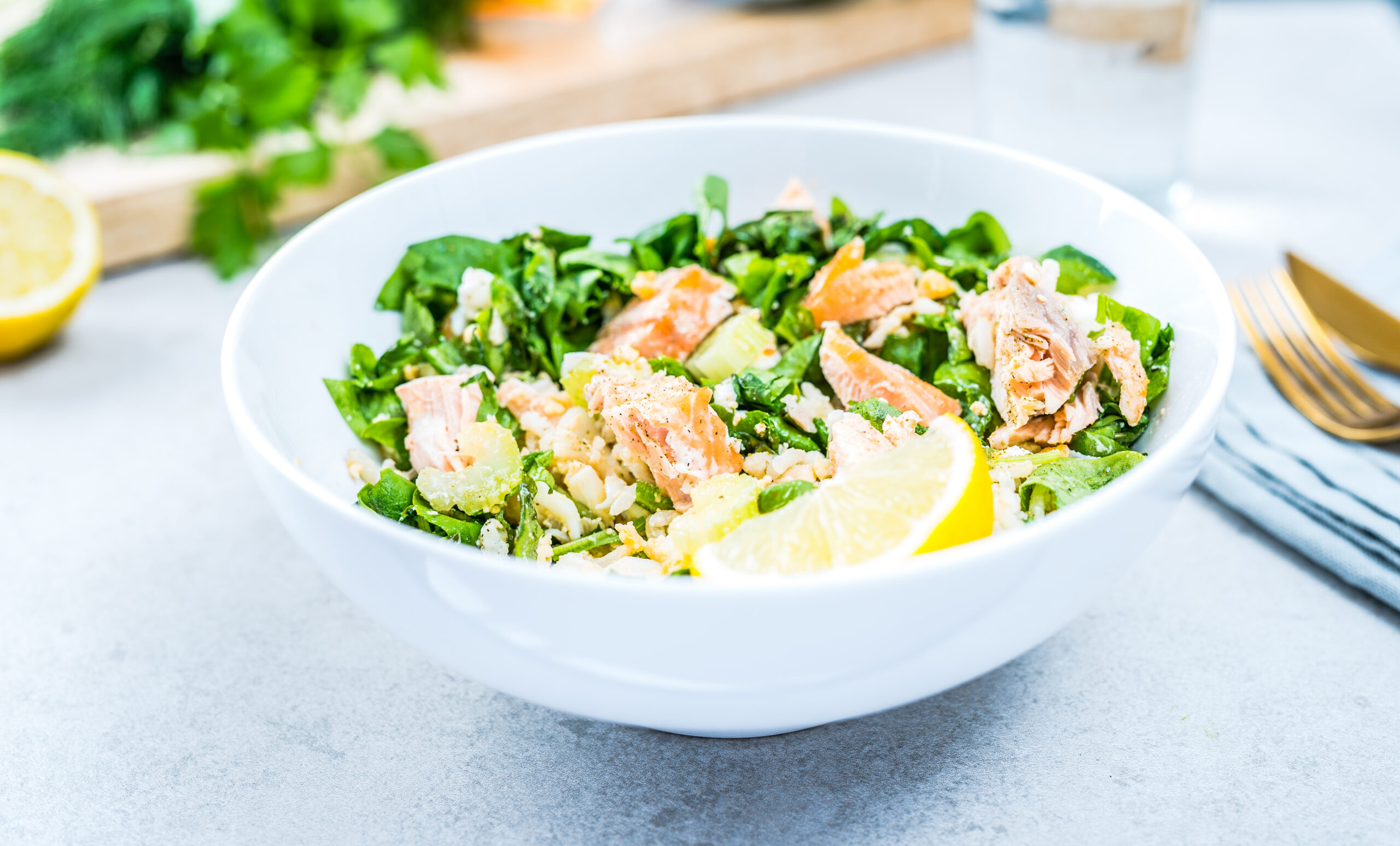 5. Sega kokku jahtunud keedetud riis, seller, spinat ja muna ning maitsesta soola ja pipraga. Kõige viimasena sega salatisse lõhefilee tükid.
