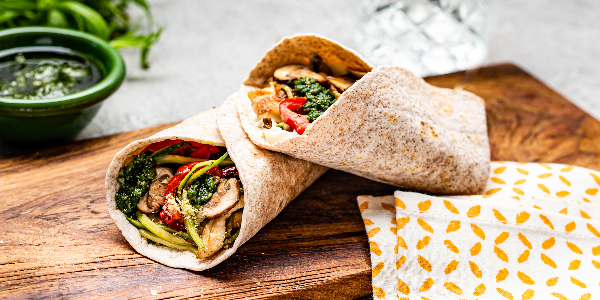 5. määri põhjale karulaugupesto ja majonees, lisa kana-juurviljasegu ning keera rulli. serveeri soojalt.