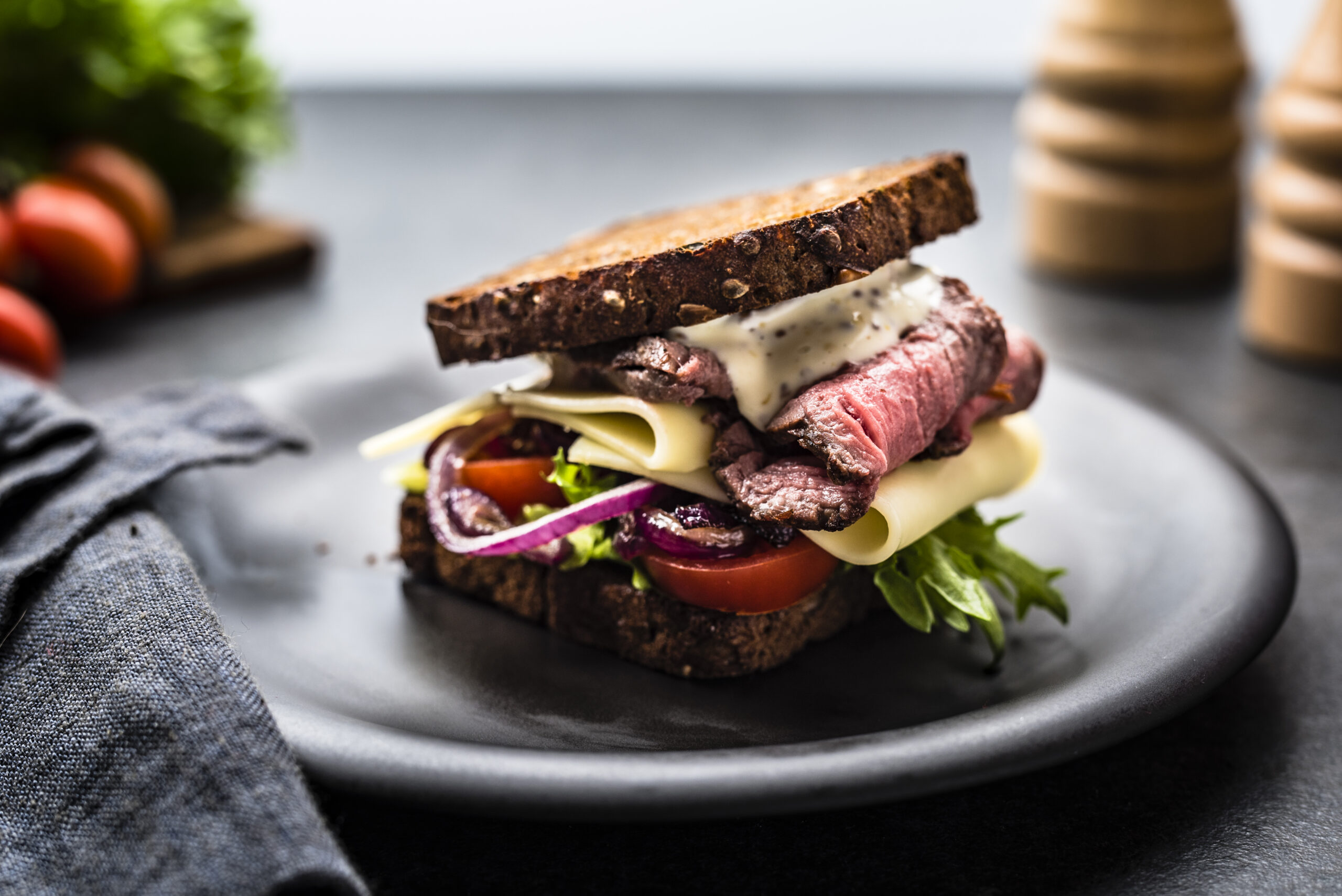 5. Aseta leivaviilule jääsalat, tomat, sibul, juust, liha ja majoneesi-sinepikaste. Kata teise leivaviiluga ja serveeri soojalt.