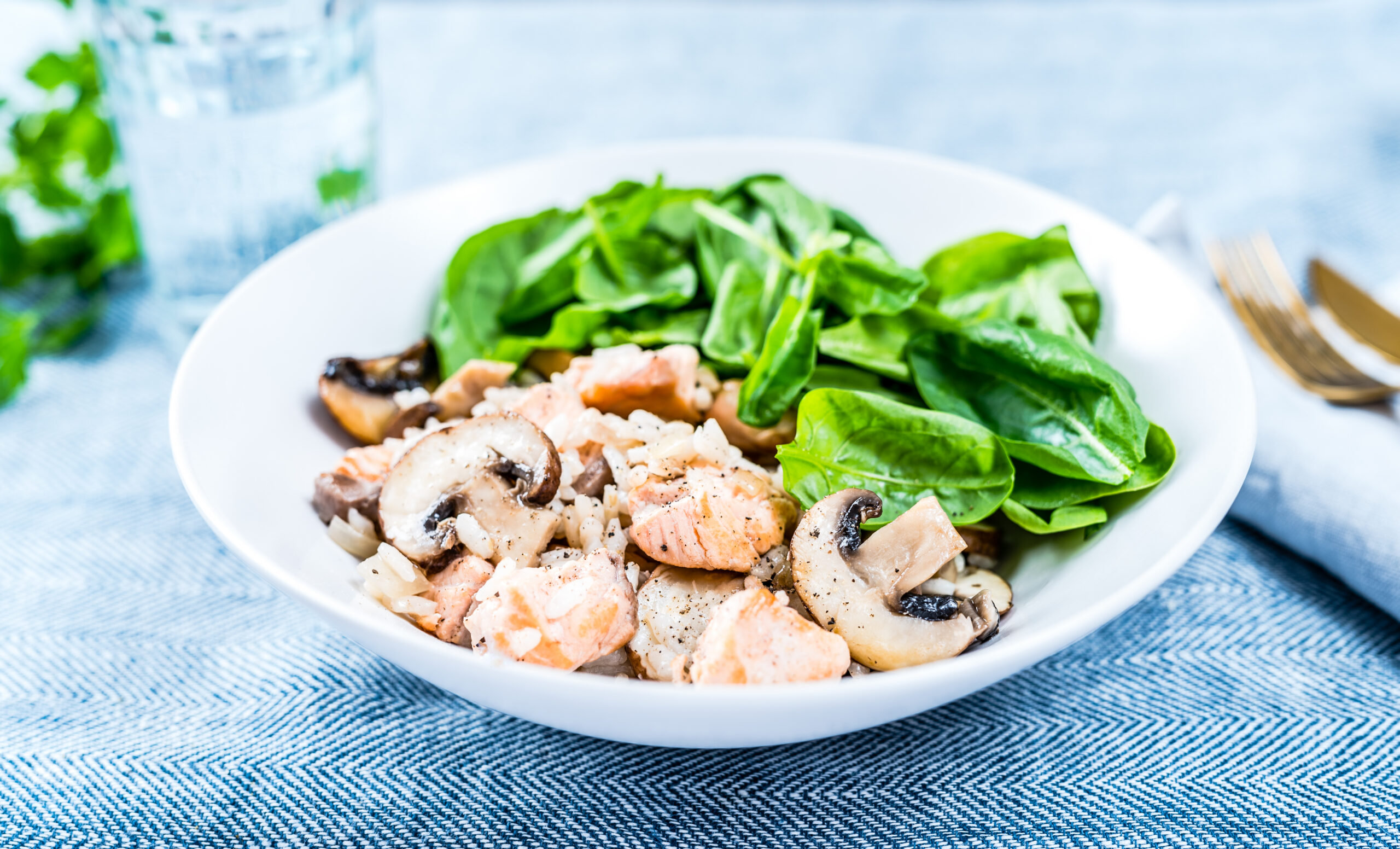 5. Lisa seejärel pannile seened, sibul ja valge vein (10ml 150g lõhe kohta). Sega hoolikalt.