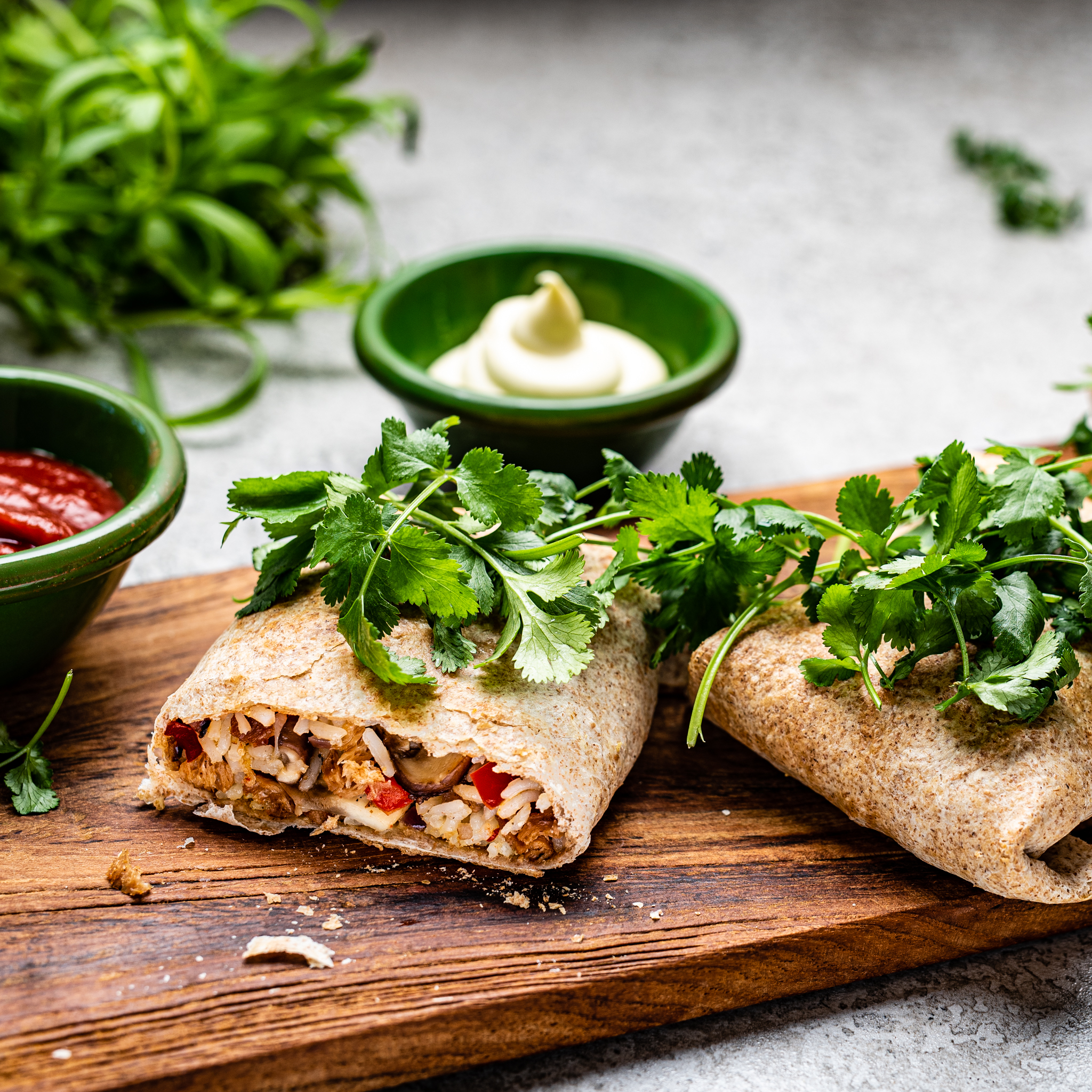 3. Laota segu tortilla põhjale, lisa juust ja voldi tortilla tihedalt kokku nii, et lahtised otsad jääksid alla. Pintselda pealt oliivõliga.